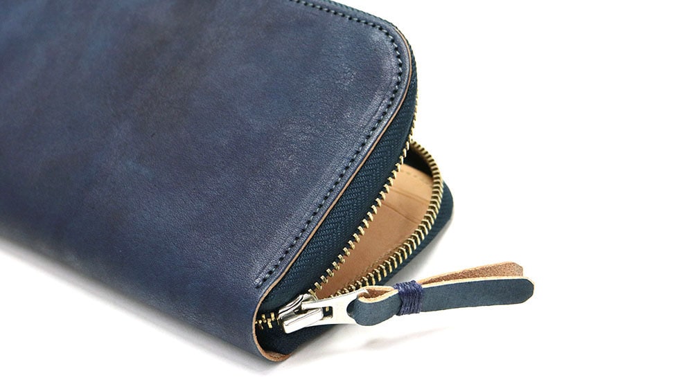 素材は、国内産の牛革を天然の大和藍の染料に浸けて染色しています。15分浸けて空気に触れることにより藍色に変化し、この作業を何度も繰り返し藍本来の色に仕上げます。最終の仕上げとして艶が持続する特殊なオイルをいれバフ仕上げした光沢感が特徴的。内装レザーとのカラーコントラストも魅力のひとつです。