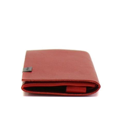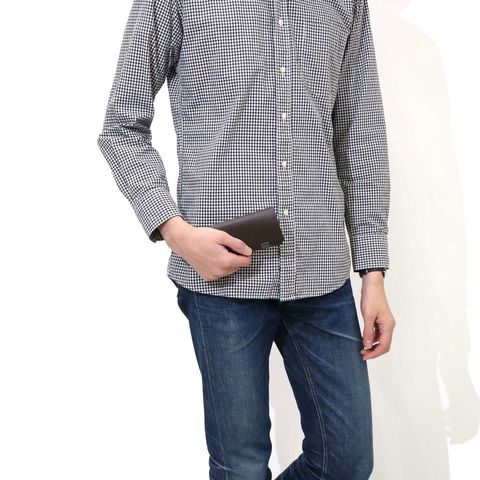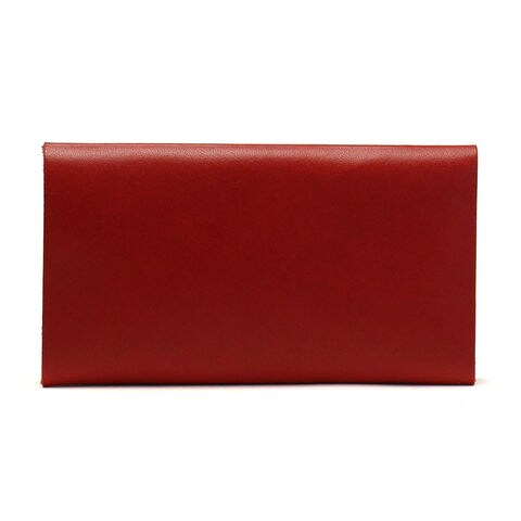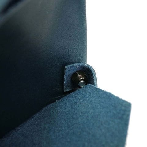 「袱紗(ふくさ)」をモチーフにし、上質な一枚革を折って成形。縫わずに最後に1点をボルト&ナットで留め付けるだけという、日本の美学が表現されたデザインです。ファスナーやボタンを使わず、レザー本来の風合いを最大限に活かしています。
