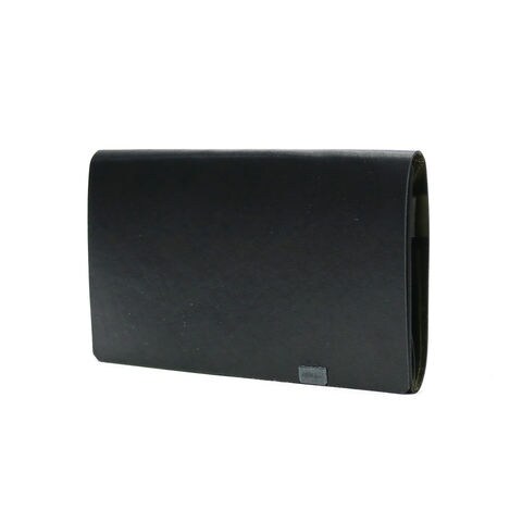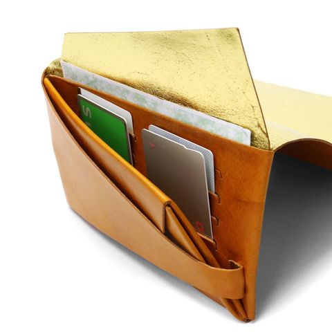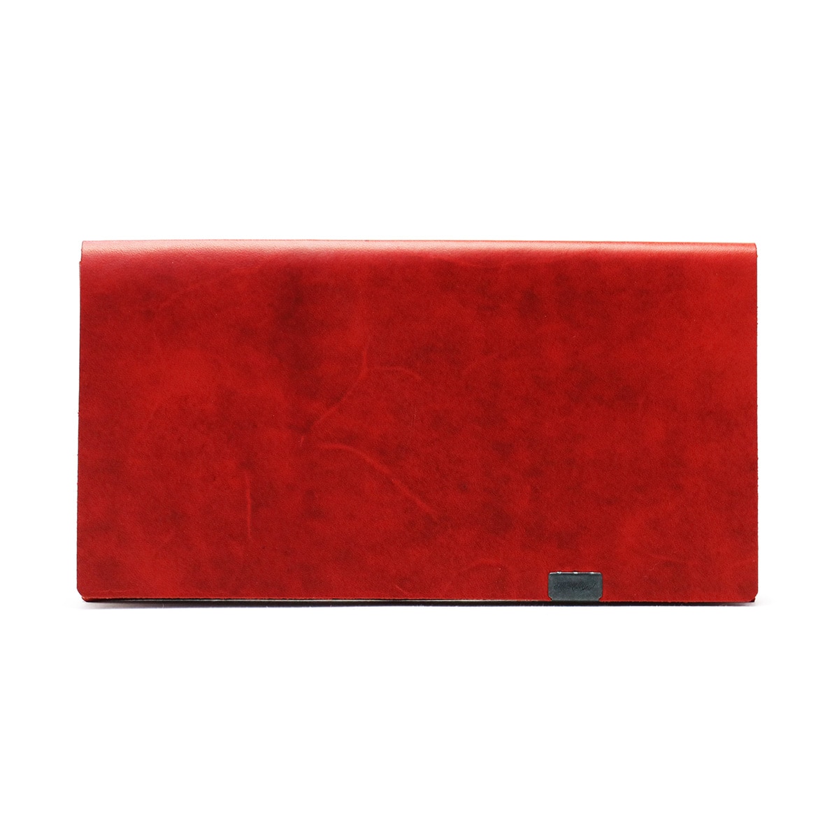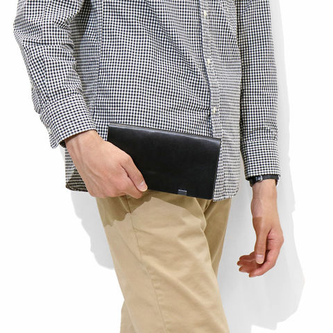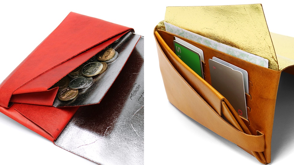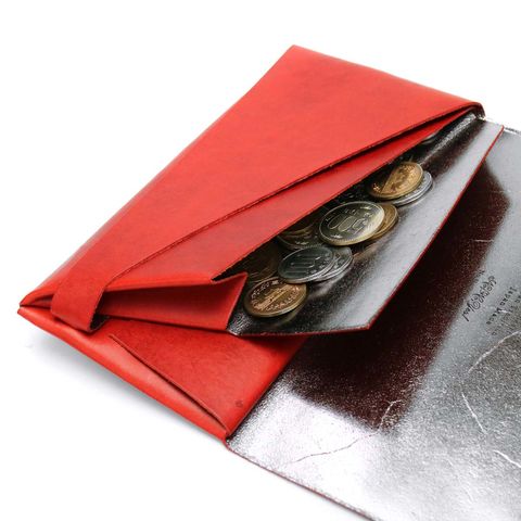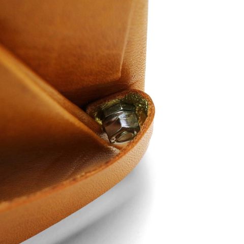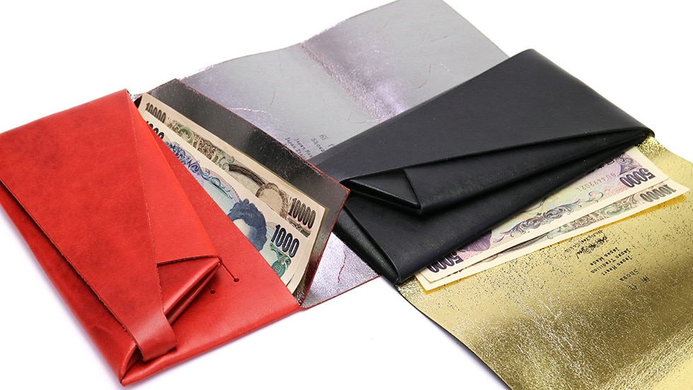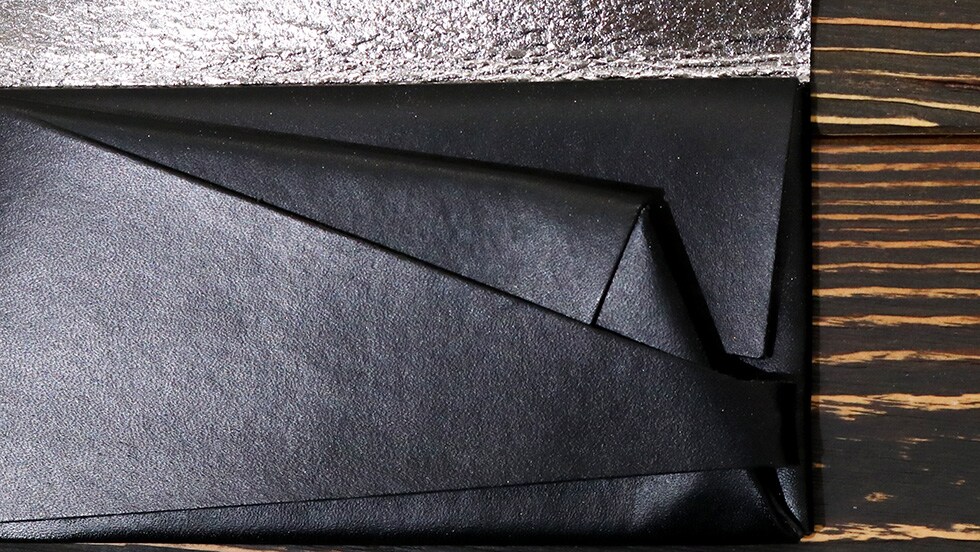 「袱紗(ふくさ)」をモチーフにし、上質な一枚革を折って成形。縫わずに最後に1点をボルト&ナットで留め付けるだけという、日本の美学が表現されたデザインです。ファスナーやボタンを使わず、レザー本来の風合いを最大限に活かしています。