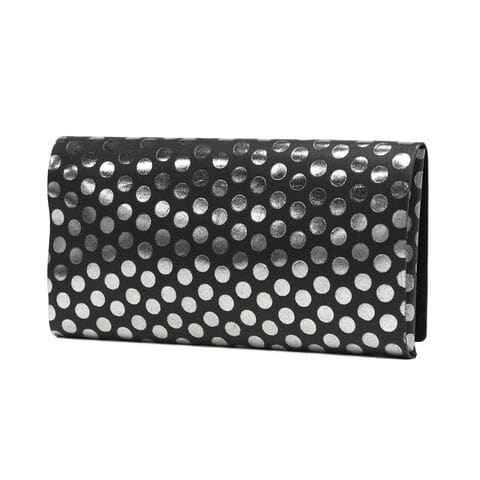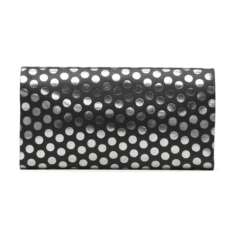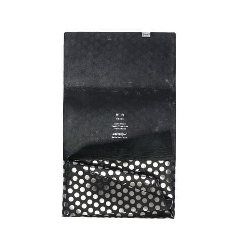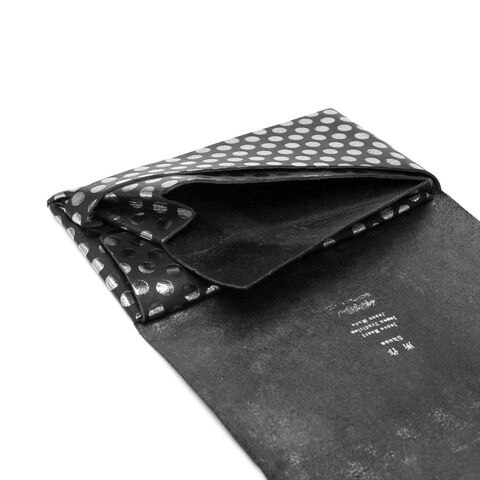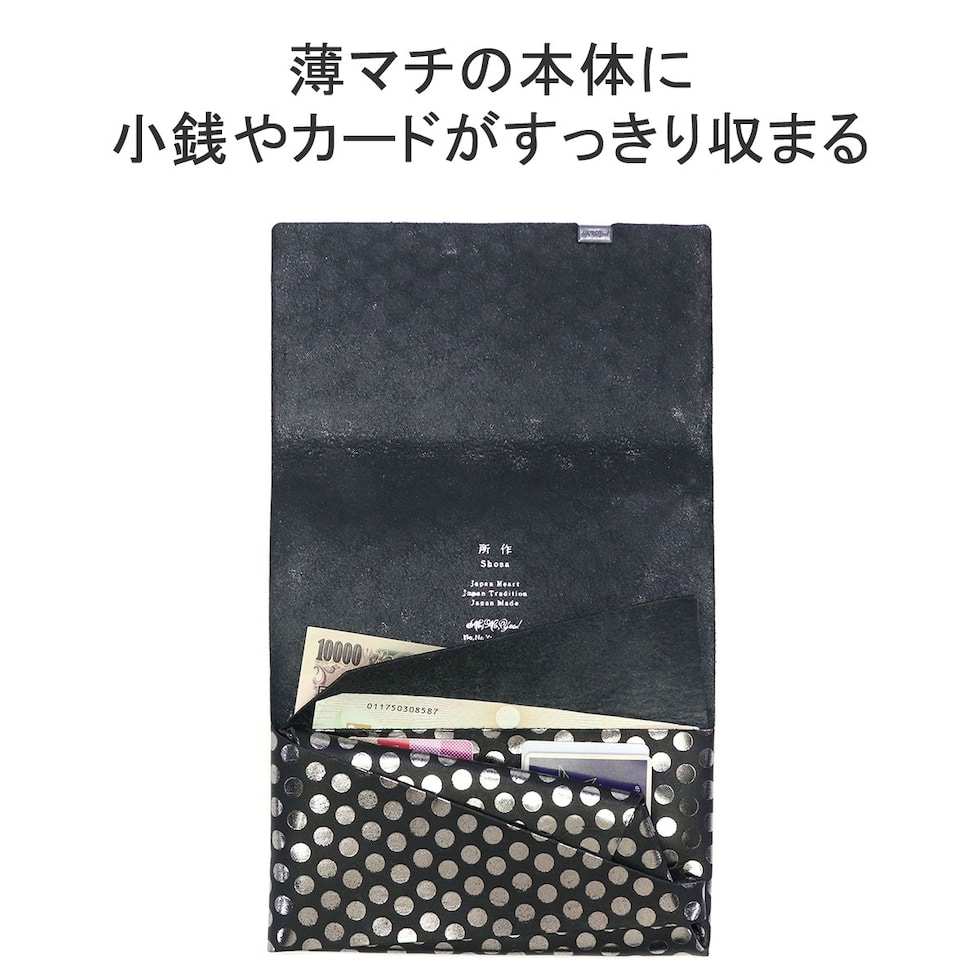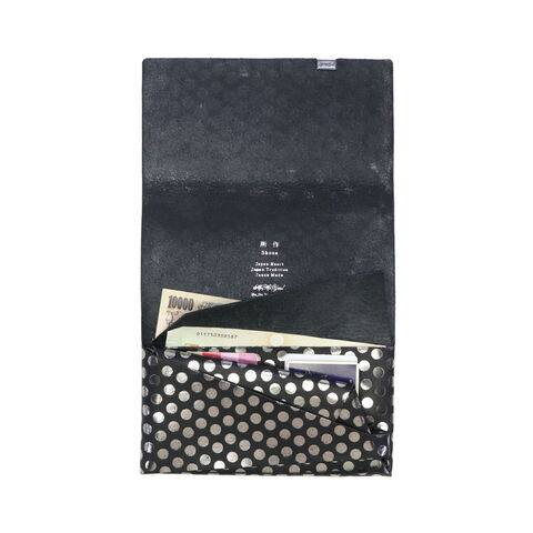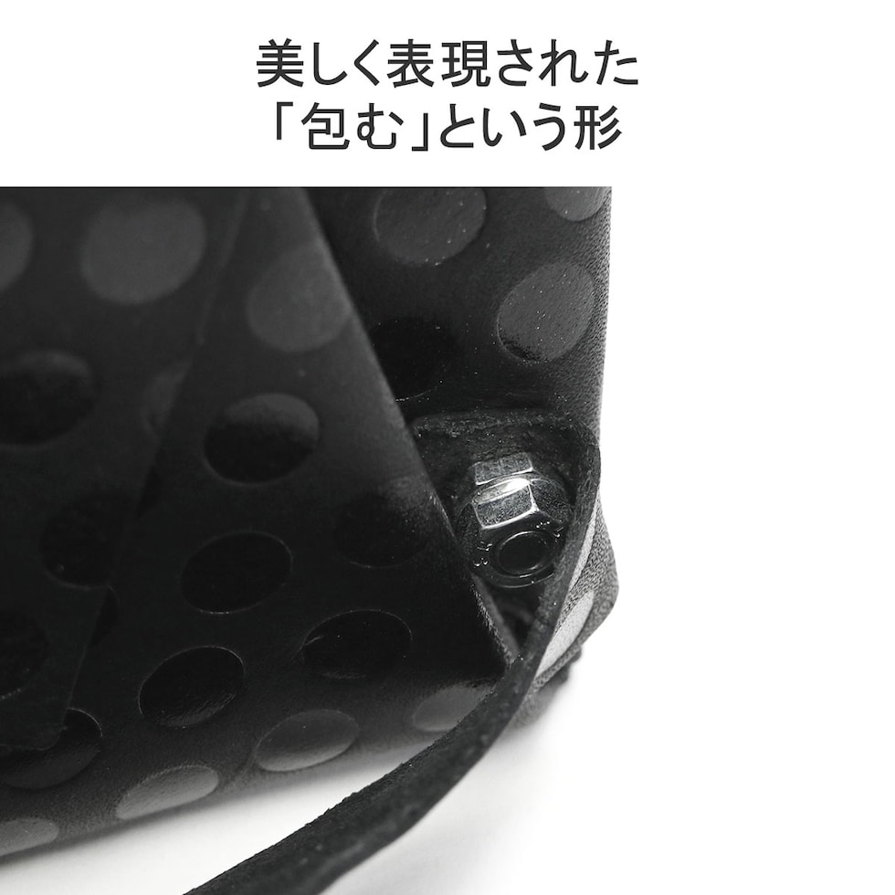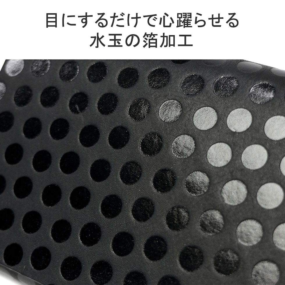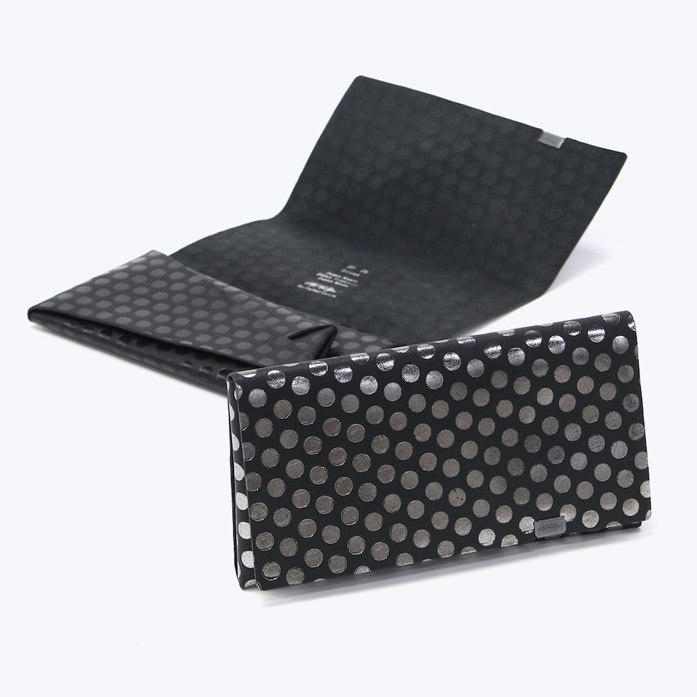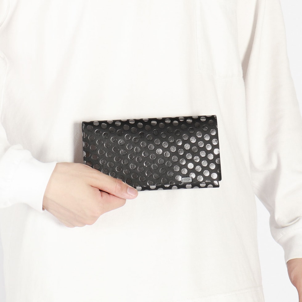 日本伝統の「折形」の紙が重なるディテールをデザインに落とし込んだ長財布。水玉模様の箔を加工したシリーズで、凹凸感のある独特の感触と、男性にも使いやすい、ポップでありハードでもあるデザインが魅力です。また、薄マチながら、札入れや小銭入れ、カードケースをしっかり備えており、使いやすくなっていのもポイント。