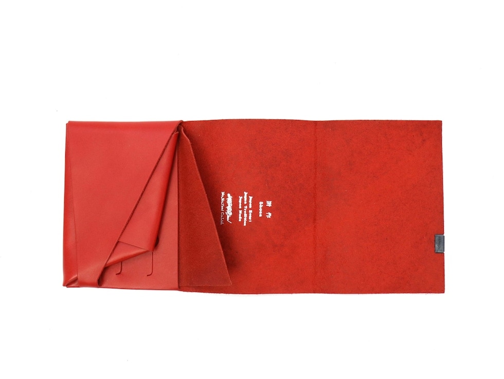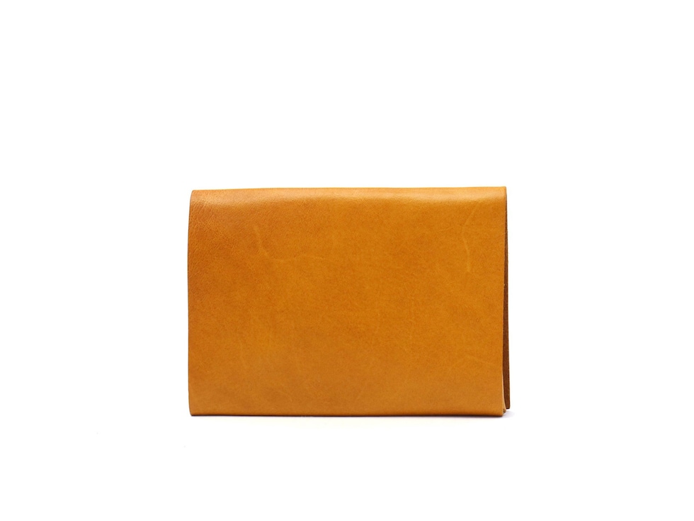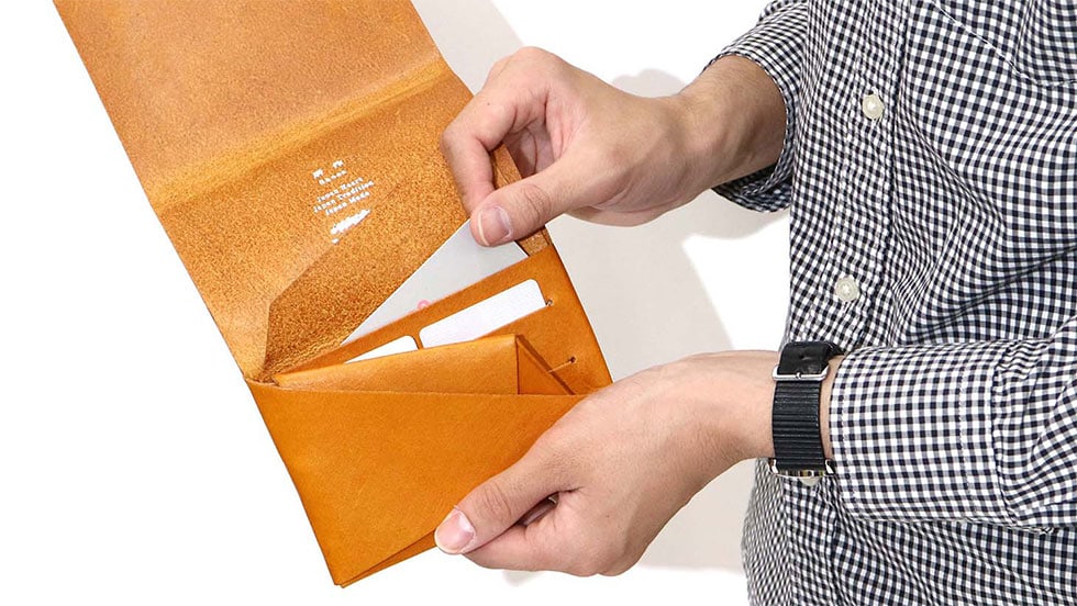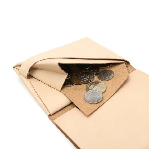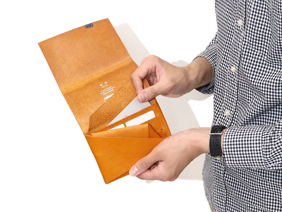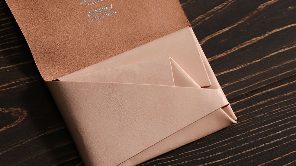 「袱紗(ふくさ)」をモチーフにし、上質な一枚革を折って成形。縫わずに最後に1点をボルト&ナットで留め付けるだけという、日本の美学が表現されたデザインです。ファスナーやボタンを使わず、レザー本来の風合いを最大限に活かしています。