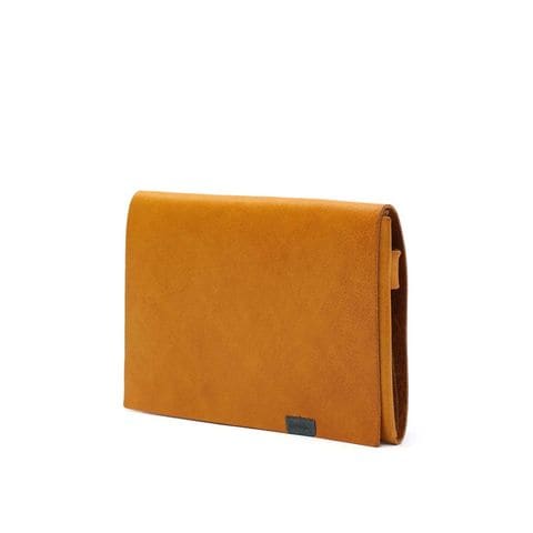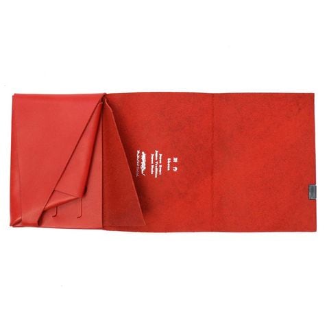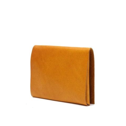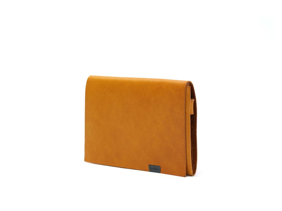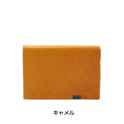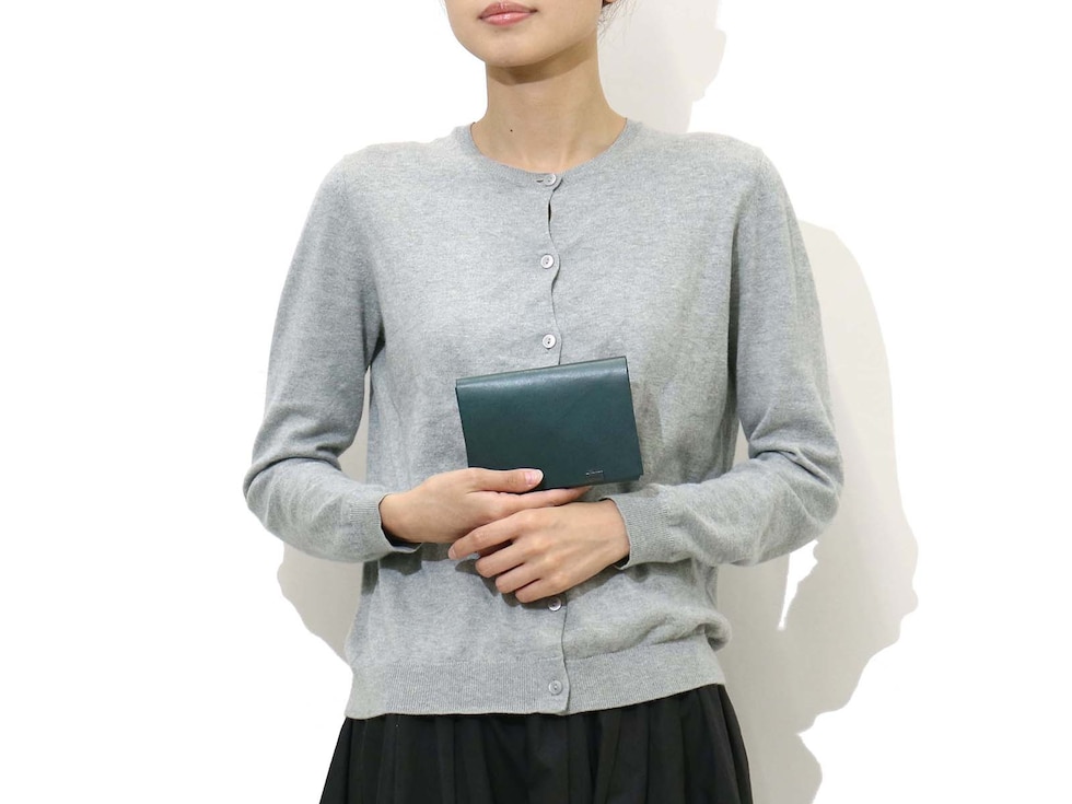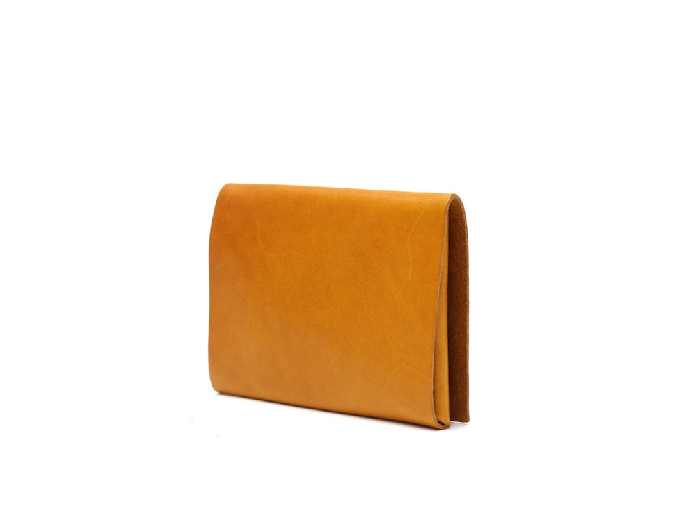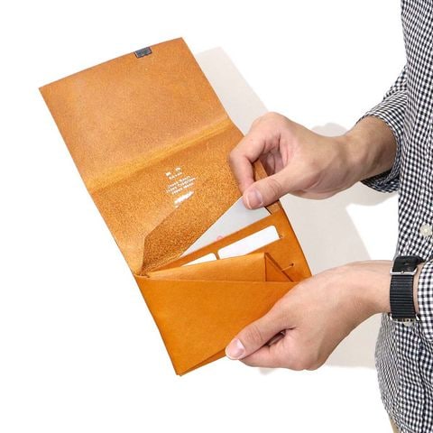 「袱紗(ふくさ)」をモチーフにし、上質な一枚革を折って成形。縫わずに最後に1点をボルト&ナットで留め付けるだけという、日本の美学が表現されたデザインです。ファスナーやボタンを使わず、レザー本来の風合いを最大限に活かしています。