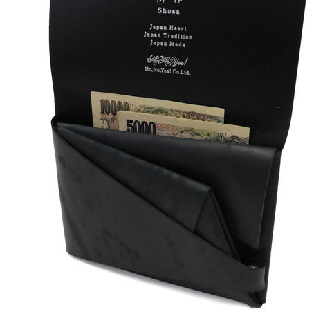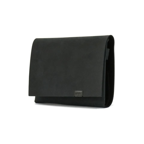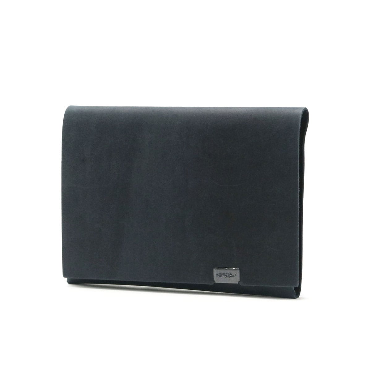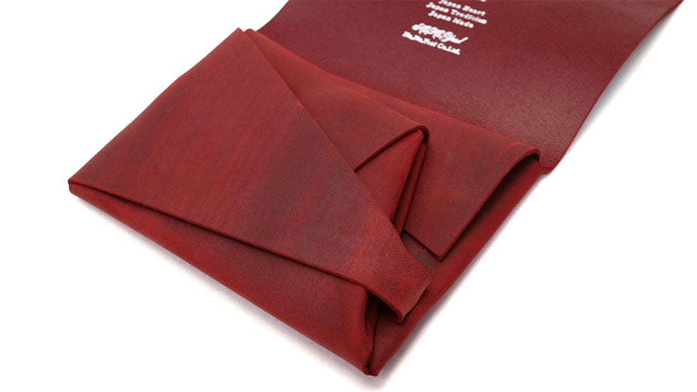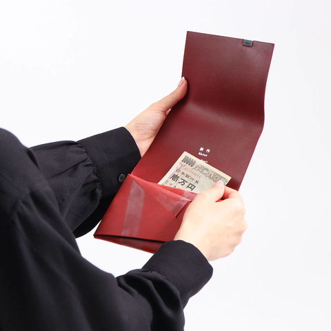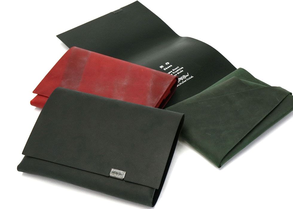 「袱紗(ふくさ)」をモチーフにし、上質な一枚革を折って成形。縫わずに最後に1点をボルト&ナットで留め付けるだけという、日本の美学が表現されたデザインです。ファスナーやボタンを使わず、レザー本来の風合いを最大限に活かしています。