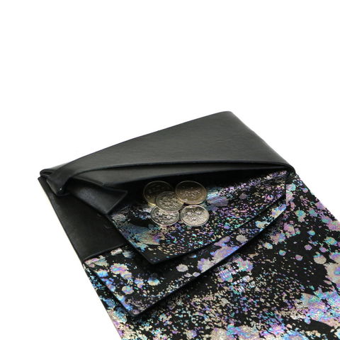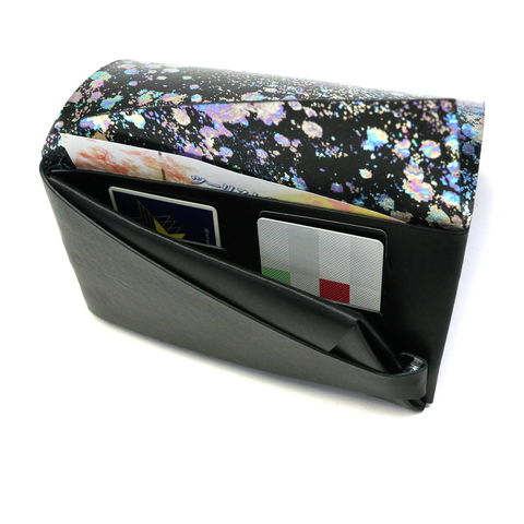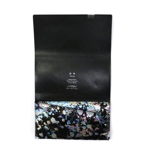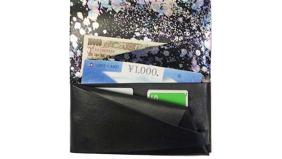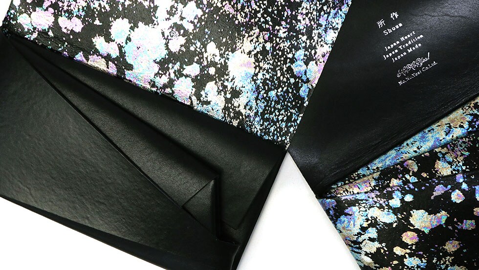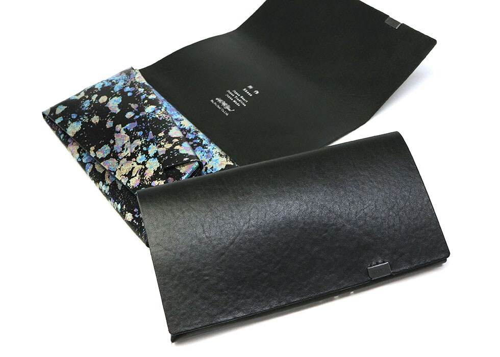 上質なブラックレザーに、まるでシャボンの雫が飛び散ったかのような箔を乗せ、幻想的な表情に仕上げた長財布。ふわふわと漂うシャボン玉の鮮やかな模様に惹かれ掴もうとすると、パチンと弾けて消えてしまう。その弾けてしまった瞬間をとじこめた、他にはない輝きを持ったデザインとなっています。