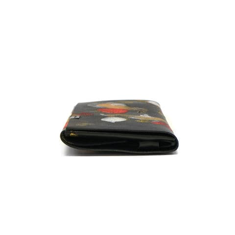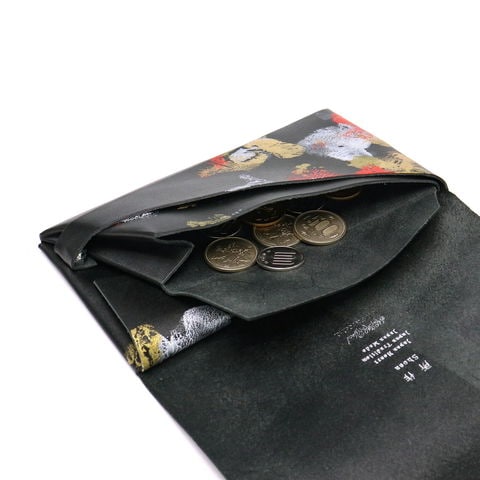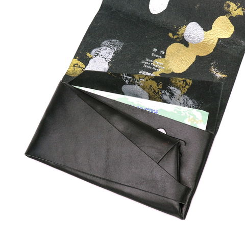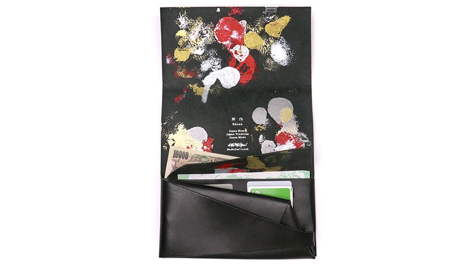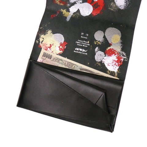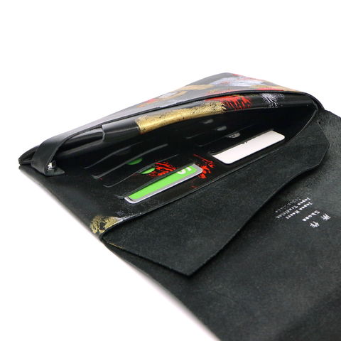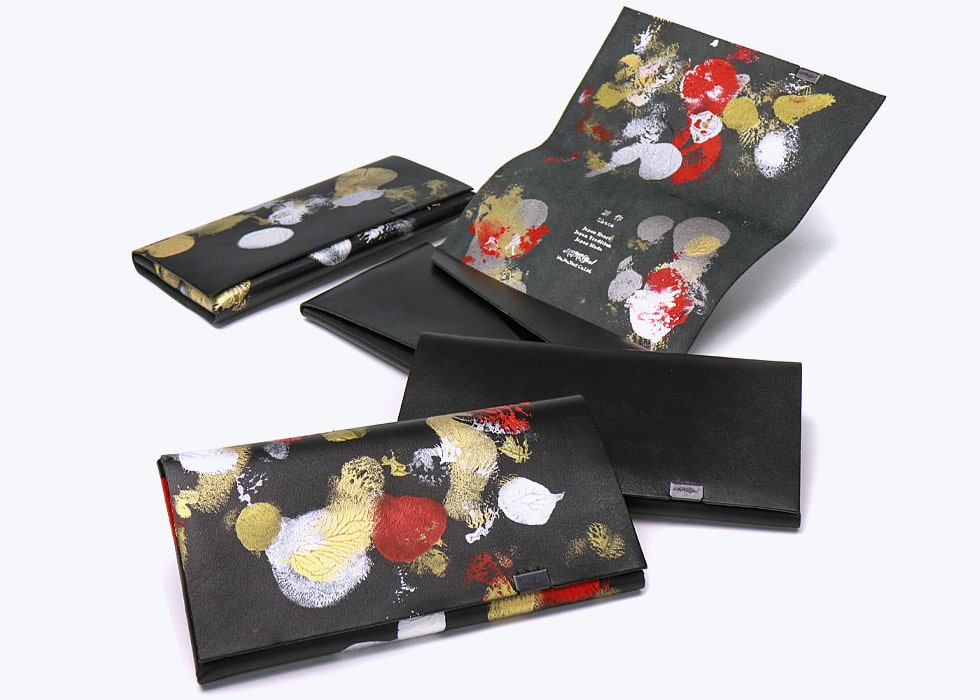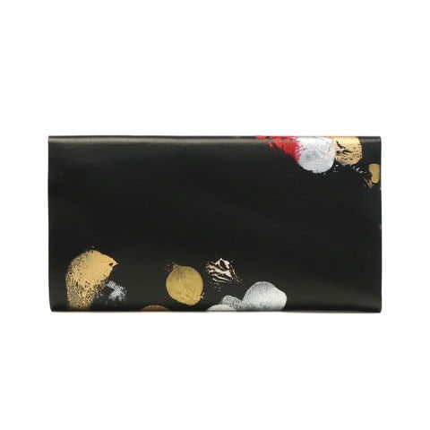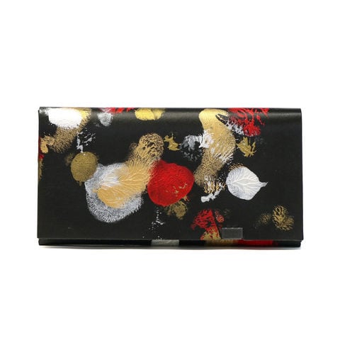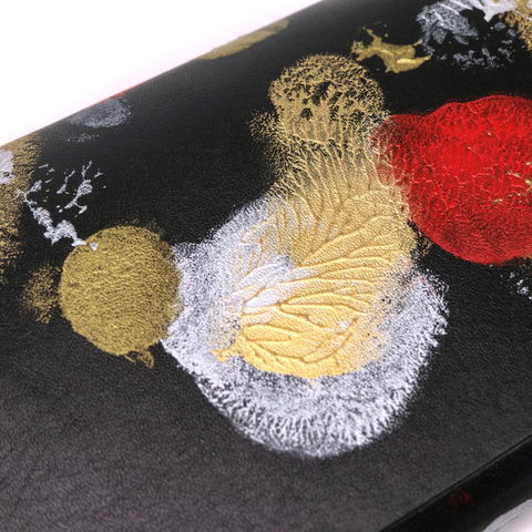 暗闇の水中を優雅に漂う金魚。ゆらゆらと光る海月。金魚と海月をモチーフに、鮮やかな「金」や「銀」の彩りでハンドランダムペイントを施した「和」を連想するような美しいデザインの三つ折り長財布。大人が持つに相応しい、遊び心のある特別な逸品です。