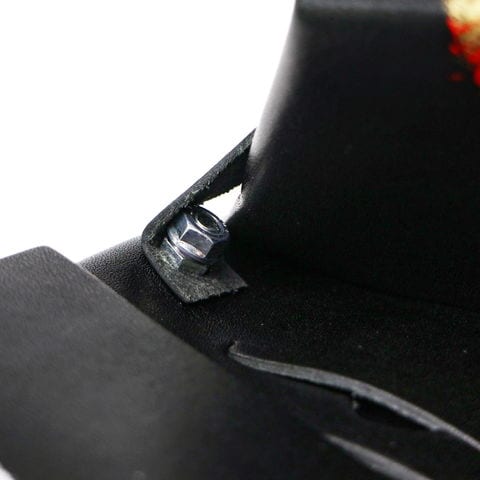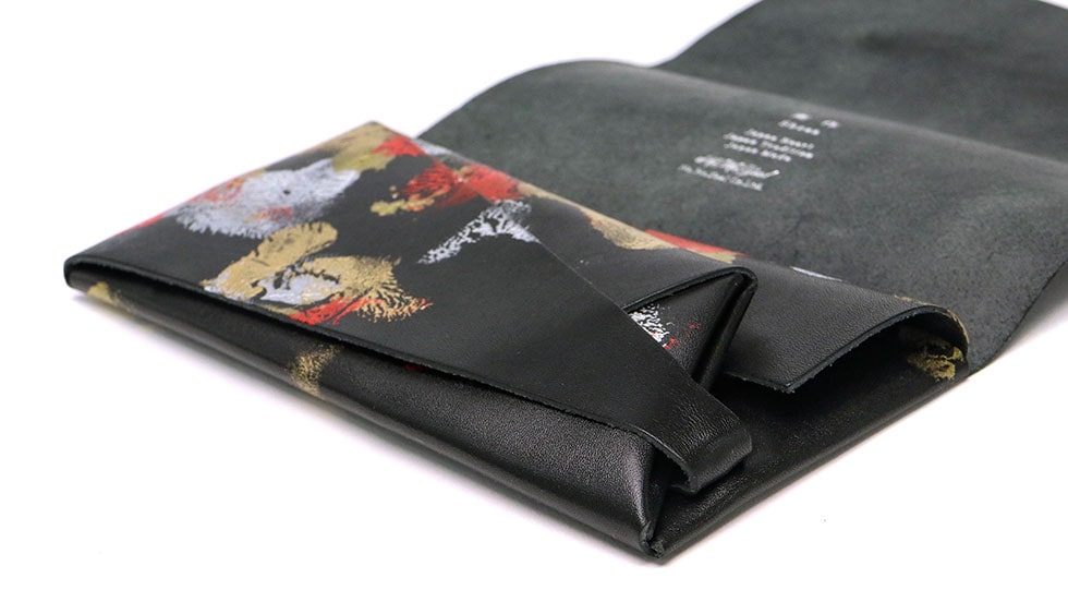 贈答品を包む「袱紗(ふくさ)」をモチーフにし、上質な一枚革を折って成形。縫わずに最後に1点をボルト&ナットで留め付けるだけという、日本の美学が表現されたデザインです。ファスナーやボタンを使わず、レザー本来の風合いを最大限に活かしています。