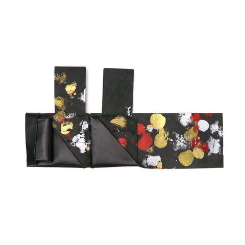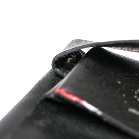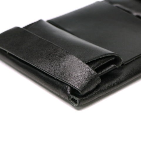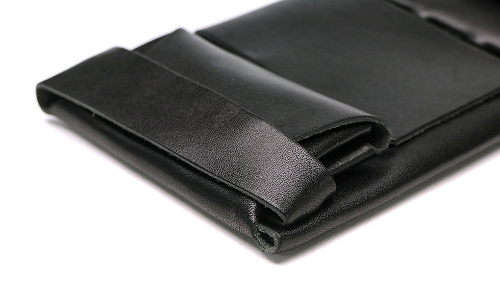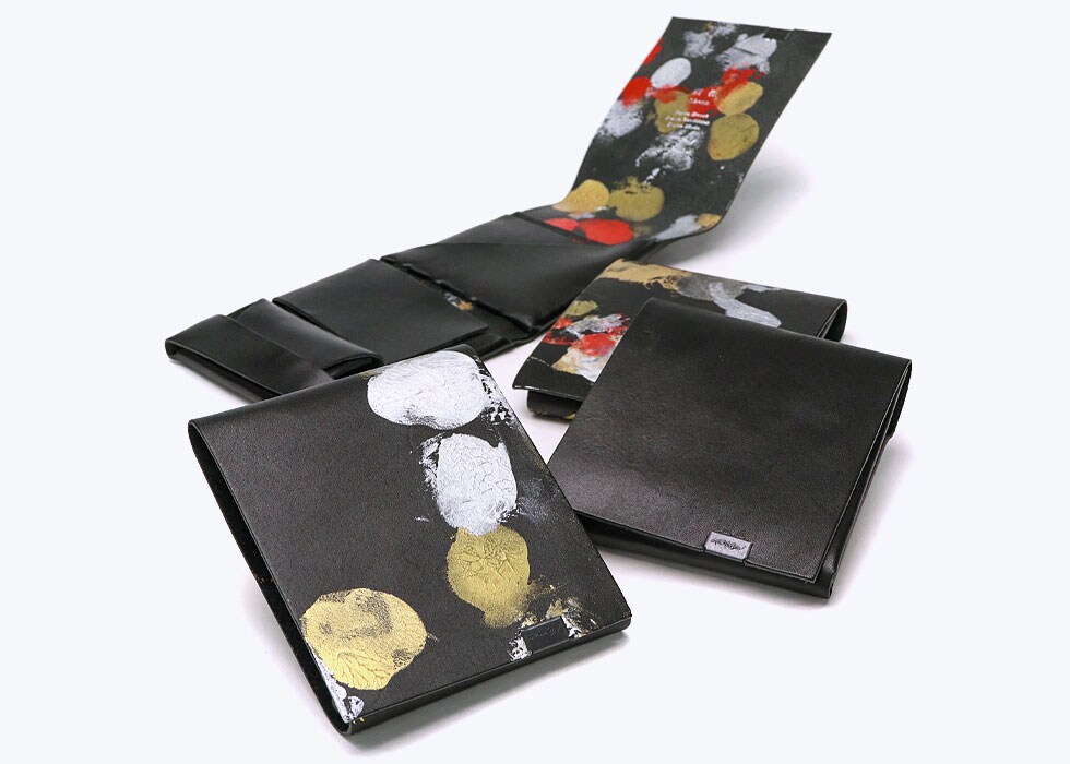 贈答品を包む「袱紗(ふくさ)」をモチーフにし、上質な一枚革を折って成形。縫わずに最後に1点をボルト&ナットで留め付けるだけという、日本の美学が表現されたデザインです。ファスナーやボタンを使わず、レザー本来の風合いを最大限に活かしています。