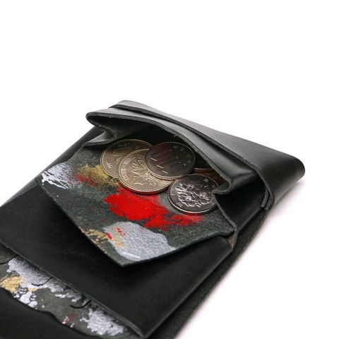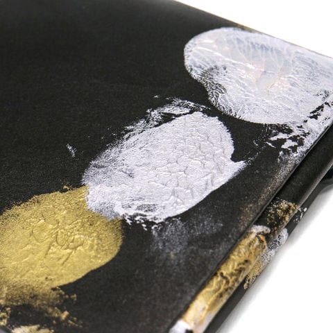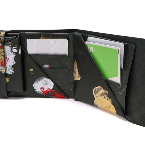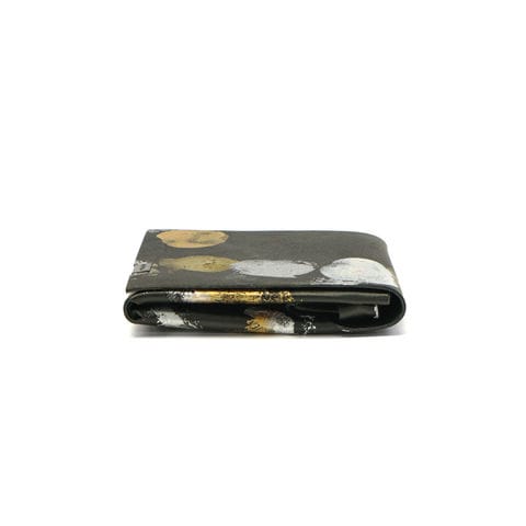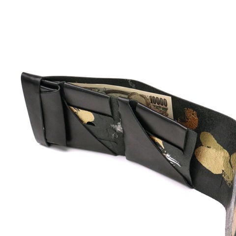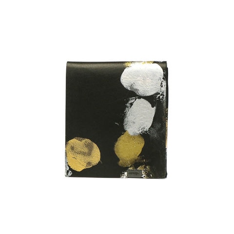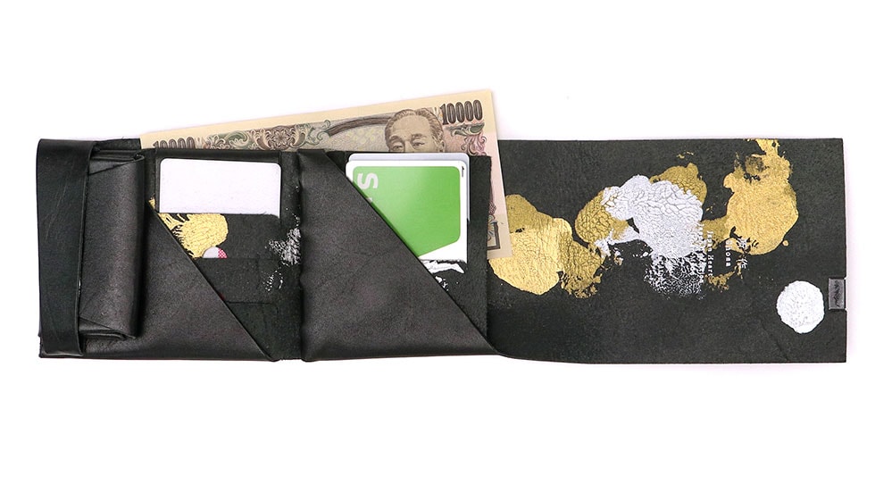 暗闇の水中を優雅に漂う金魚。ゆらゆらと光る海月。金魚と海月をモチーフに、鮮やかな「金」や「銀」の彩りでハンドランダムペイントを施した「和」を連想するような美しいデザインの三つ折り短財布。大人が持つに相応しい、遊び心のある特別な逸品です。