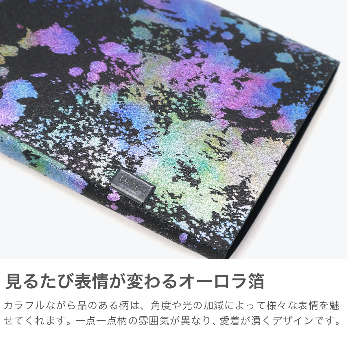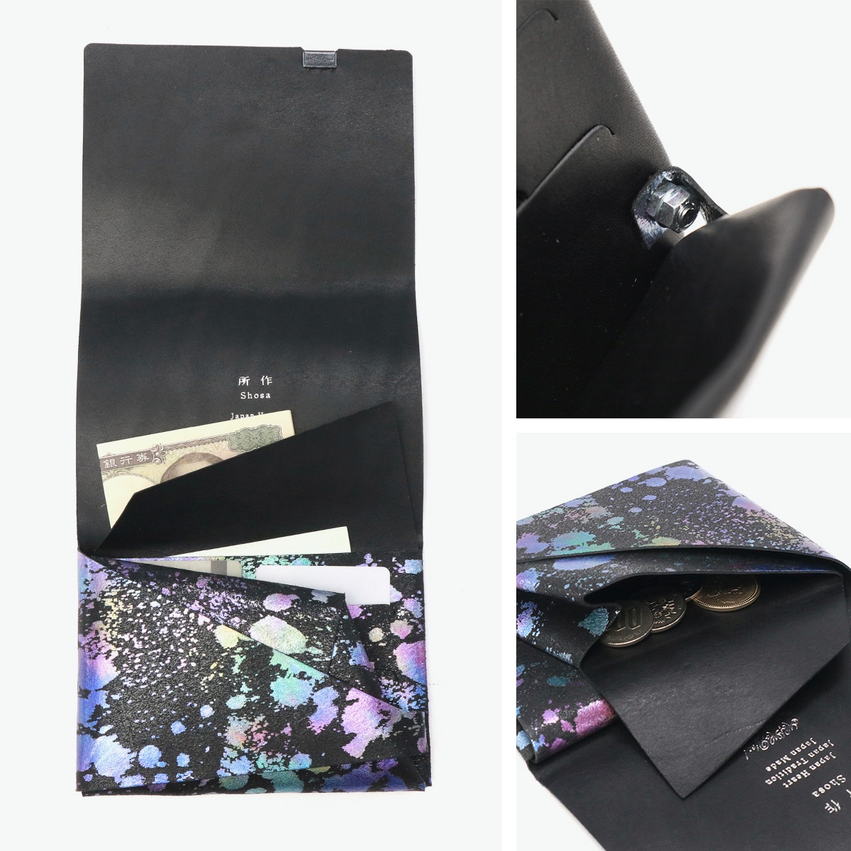 ペンキを散らしたかの様な孔雀色のカラーリングが目を惹く三つ折り財布。贈答品を包む「袱紗(ふくさ)」をモチーフにし、上質な一枚革を折って成形。縫わずに最後に1点をボルト&ナットで留め付けるだけという、日本の美学が表現されたデザインです。目立ちながらに品がある柄は、見る角度や光の加減により異なる表情を魅せ、見るだけでもウットリとした良い気分になれます。
