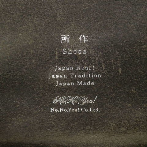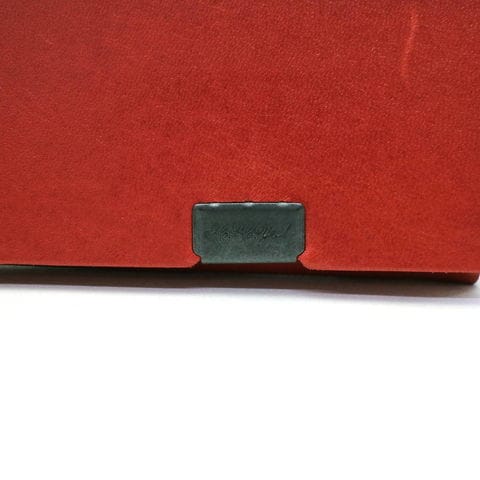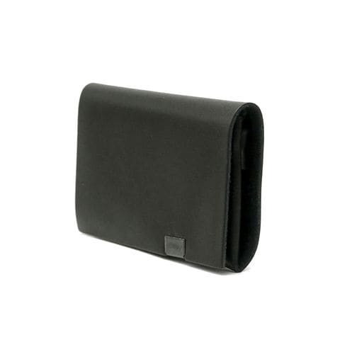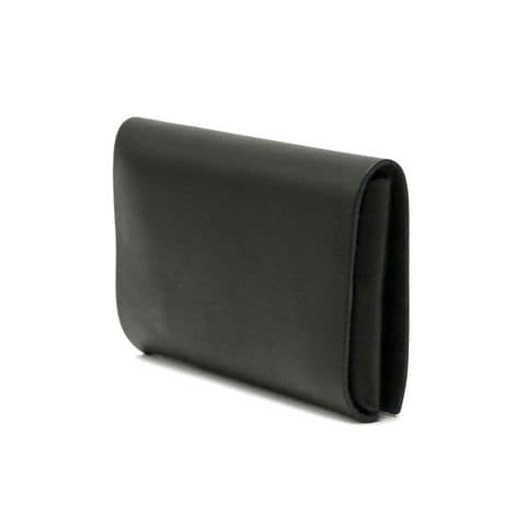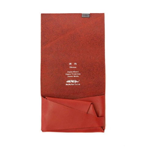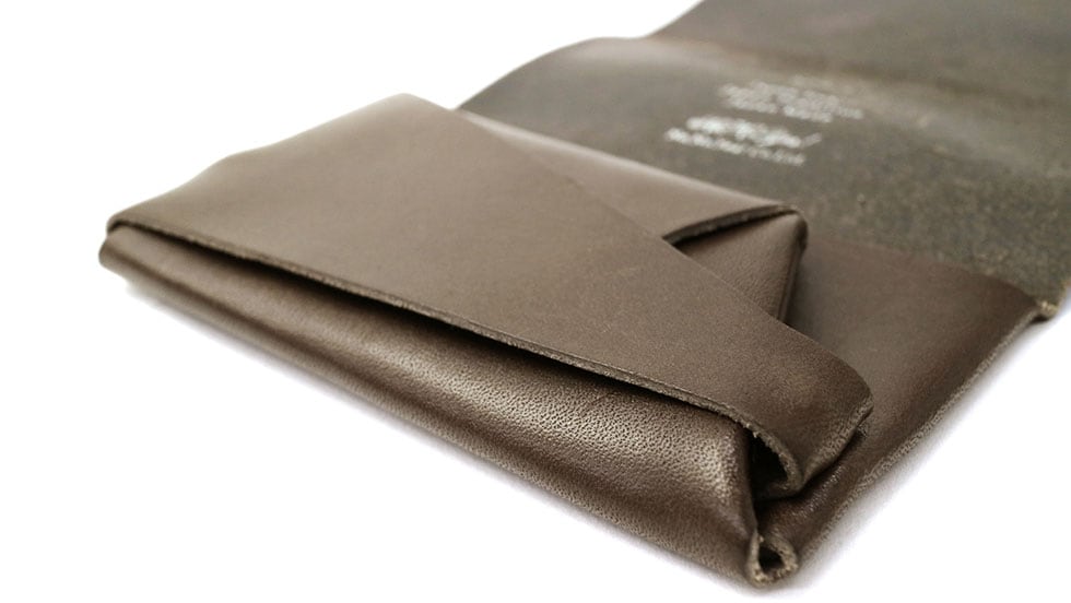 「袱紗(ふくさ)」をモチーフにし、上質な一枚革を折って成形。縫わずに最後に1点をボルト&ナットで留め付けるだけという、日本の美学が表現されたデザインです。ファスナーやボタンを使わず、レザー本来の風合いを最大限に活かしています。