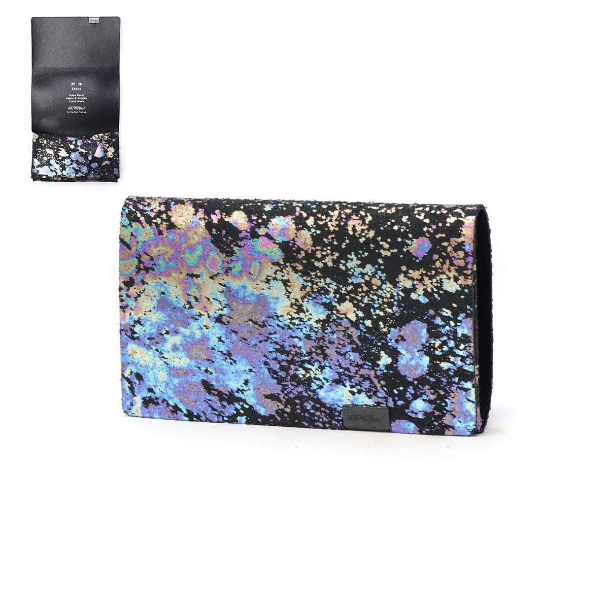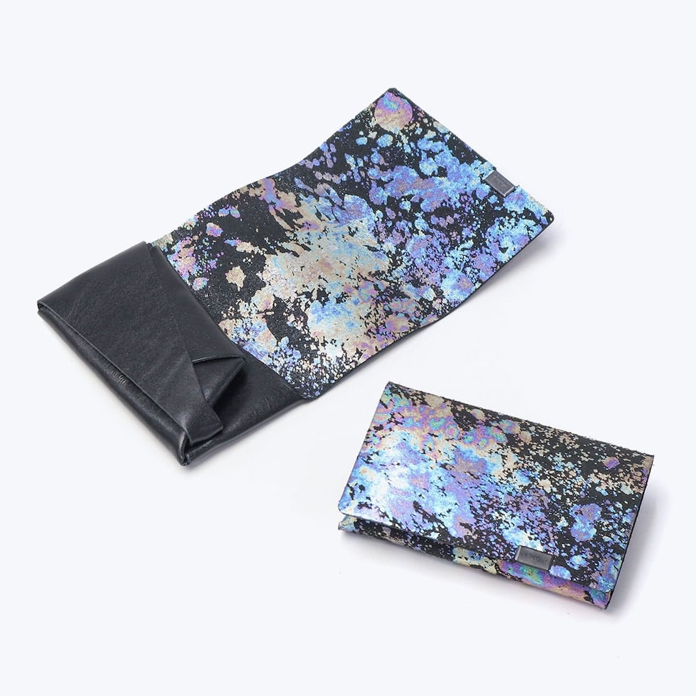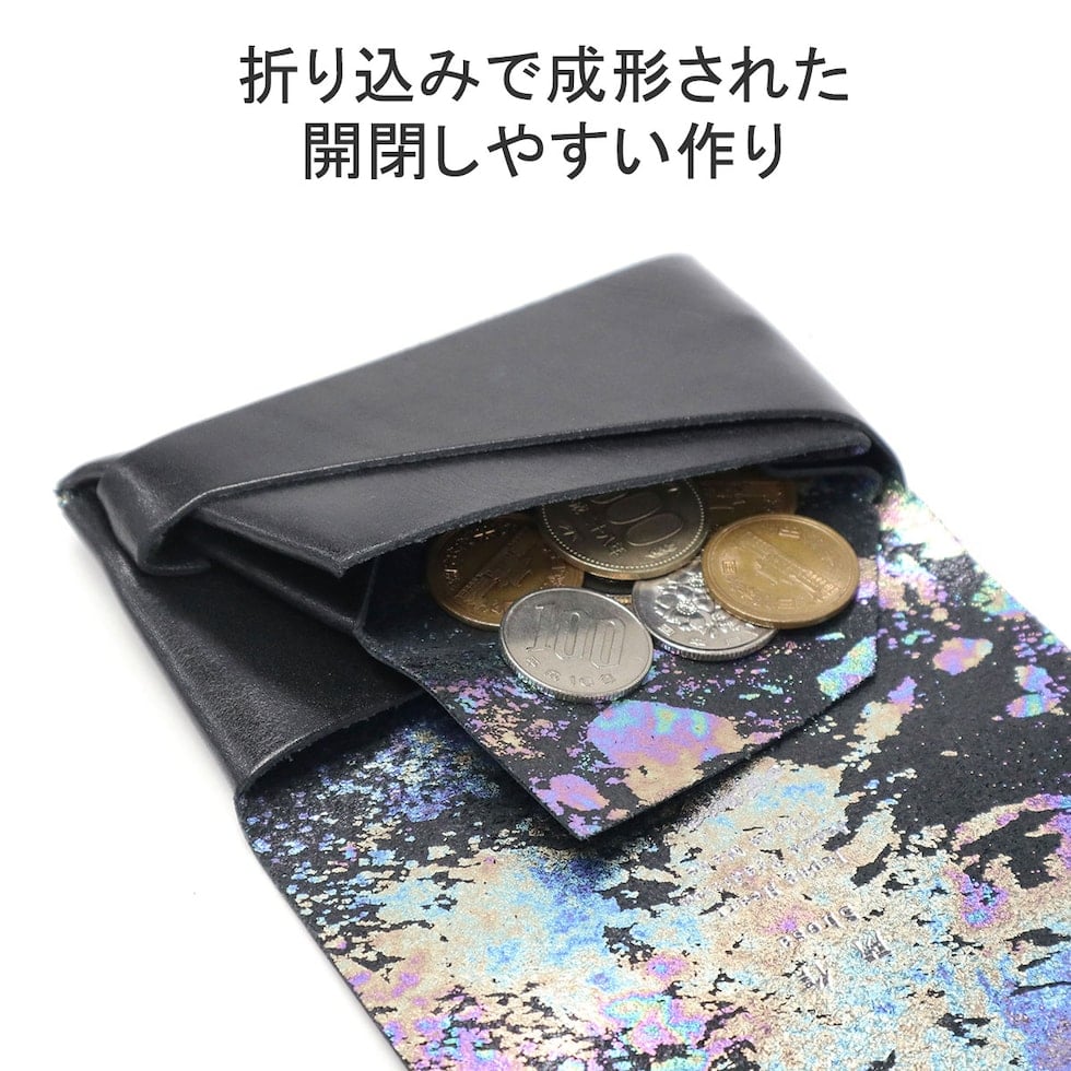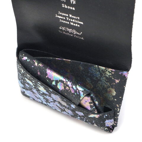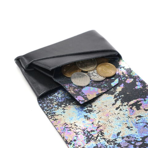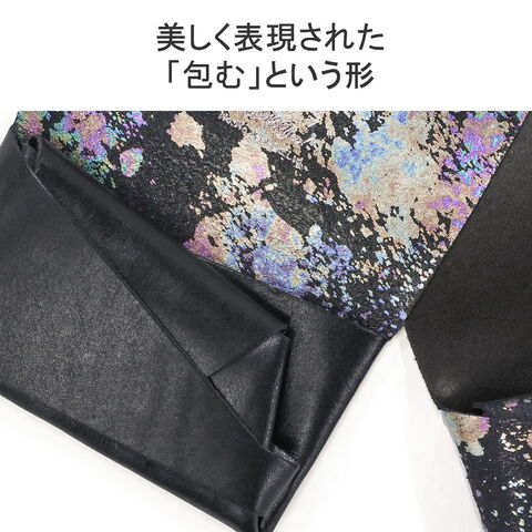 上質なブラックレザーに、まるでシャボンの雫が飛び散ったかのような箔を乗せ、幻想的な表情に仕上げたコインケース。贈答品を包む「袱紗(ふくさ)」をモチーフにし一枚革を折って成形。縫わずに最後に1点をボルト&ナットで留め付けるだけという、日本の美学が表現されたデザインです。ファスナーやボタンを使わずレザー本来の風合いを最大限に活かしています。