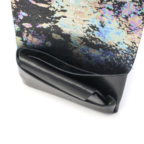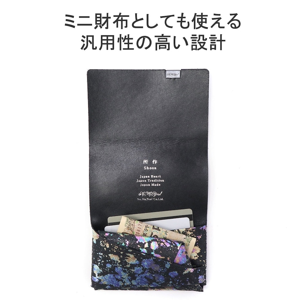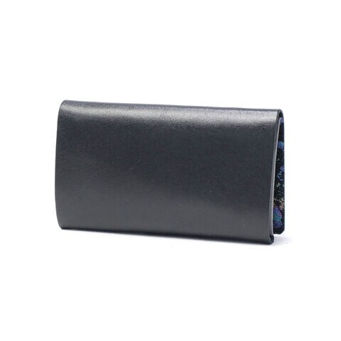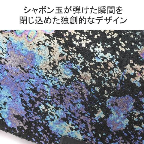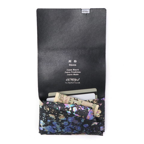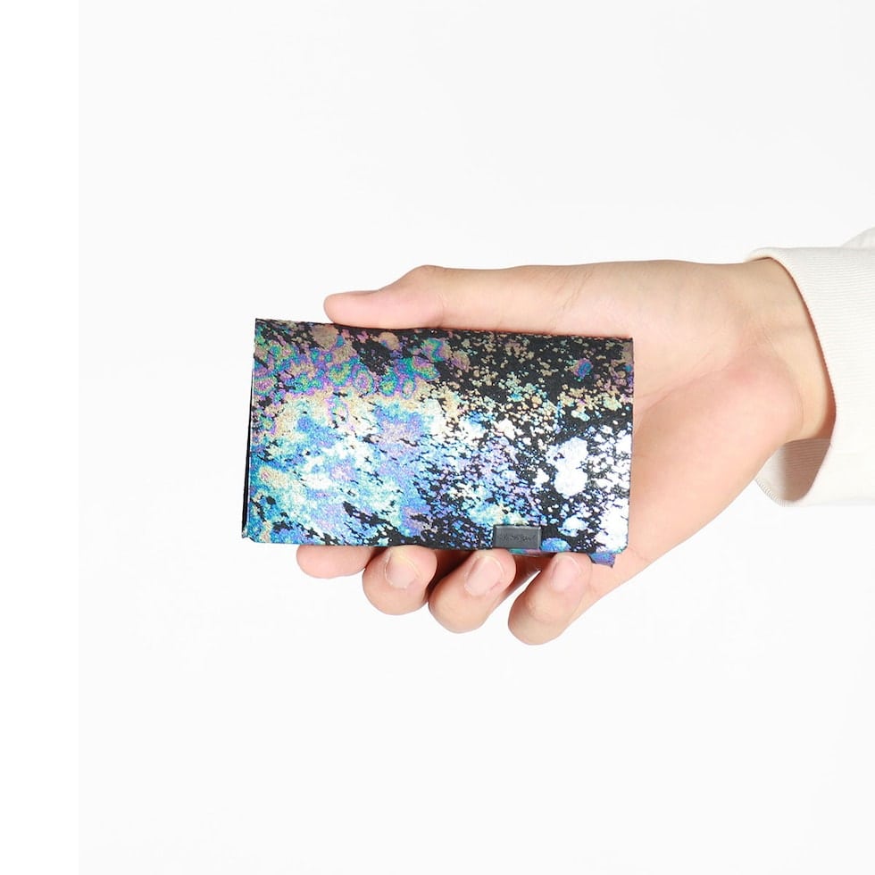 上質なブラックレザーに、まるでシャボンの雫が飛び散ったかのような箔を乗せ、幻想的な表情に仕上げたコインケース。贈答品を包む「袱紗(ふくさ)」をモチーフにし一枚革を折って成形。縫わずに最後に1点をボルト&ナットで留め付けるだけという、日本の美学が表現されたデザインです。ファスナーやボタンを使わずレザー本来の風合いを最大限に活かしています。
