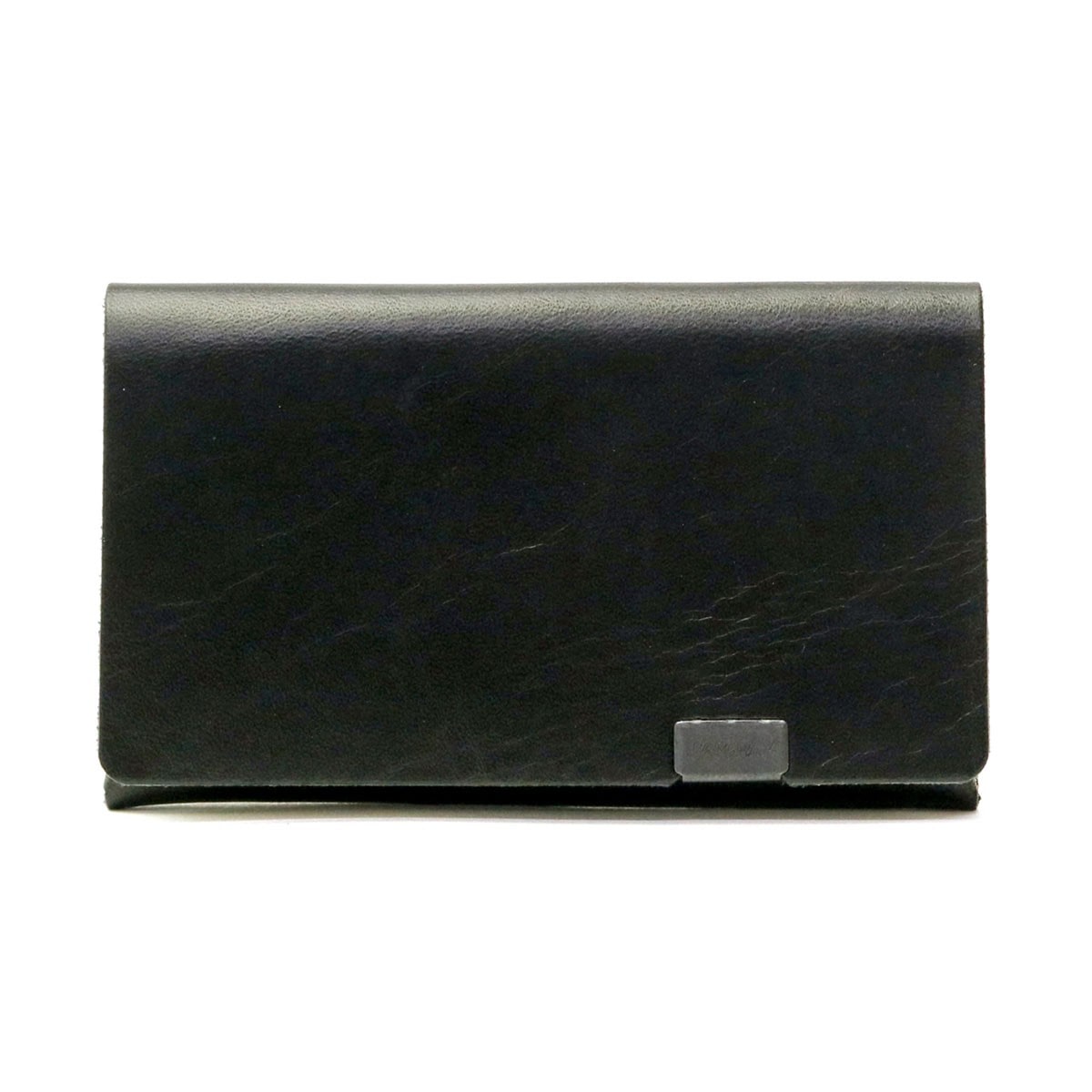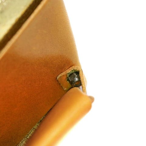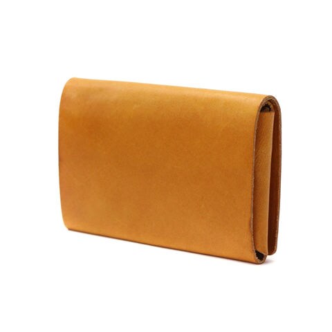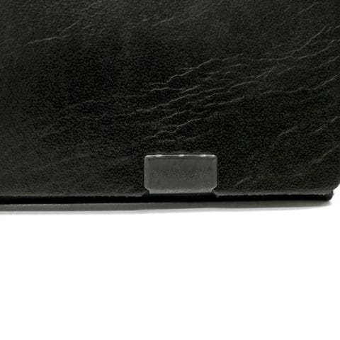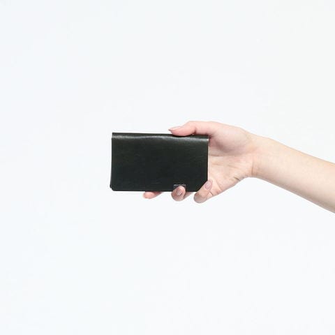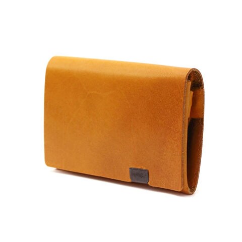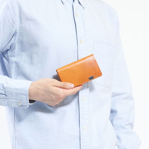 「袱紗(ふくさ)」をモチーフにし、上質な一枚革を折って成形。縫わずに最後に1点をボルト&ナットで留め付けるだけという、日本の美学が表現されたデザインです。ファスナーやボタンを使わず、レザー本来の風合いを最大限に活かしています。