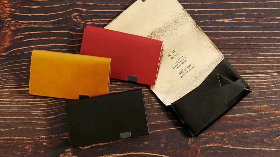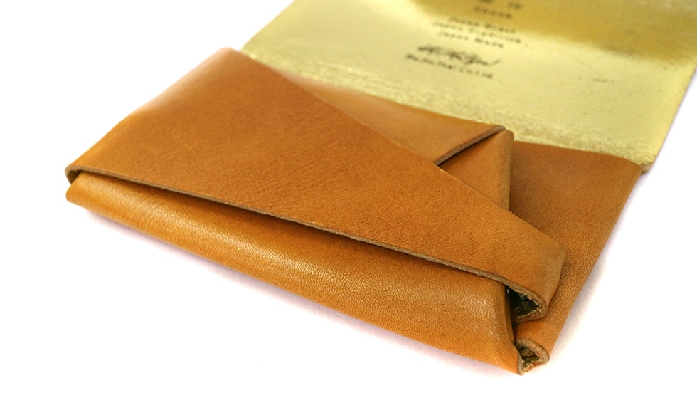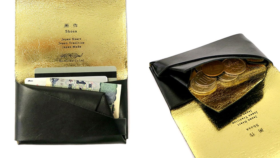日本伝統の「折形」の紙が重なるディテールをデザインに落とし込んだコインケース。中身を取り出す際の仕草や動作などの「所作」を美しくみせるアイテムです。裏箔は使い込むと少しずつ箔が剥がれ、ヴィンテージの金銀細工のような趣が魅力です。