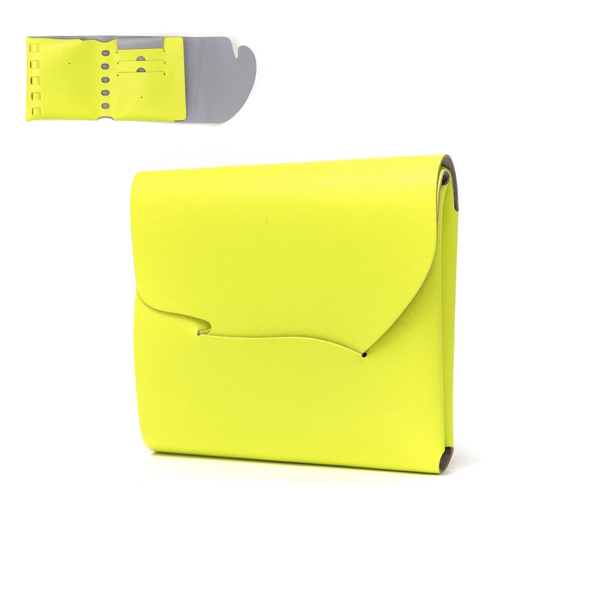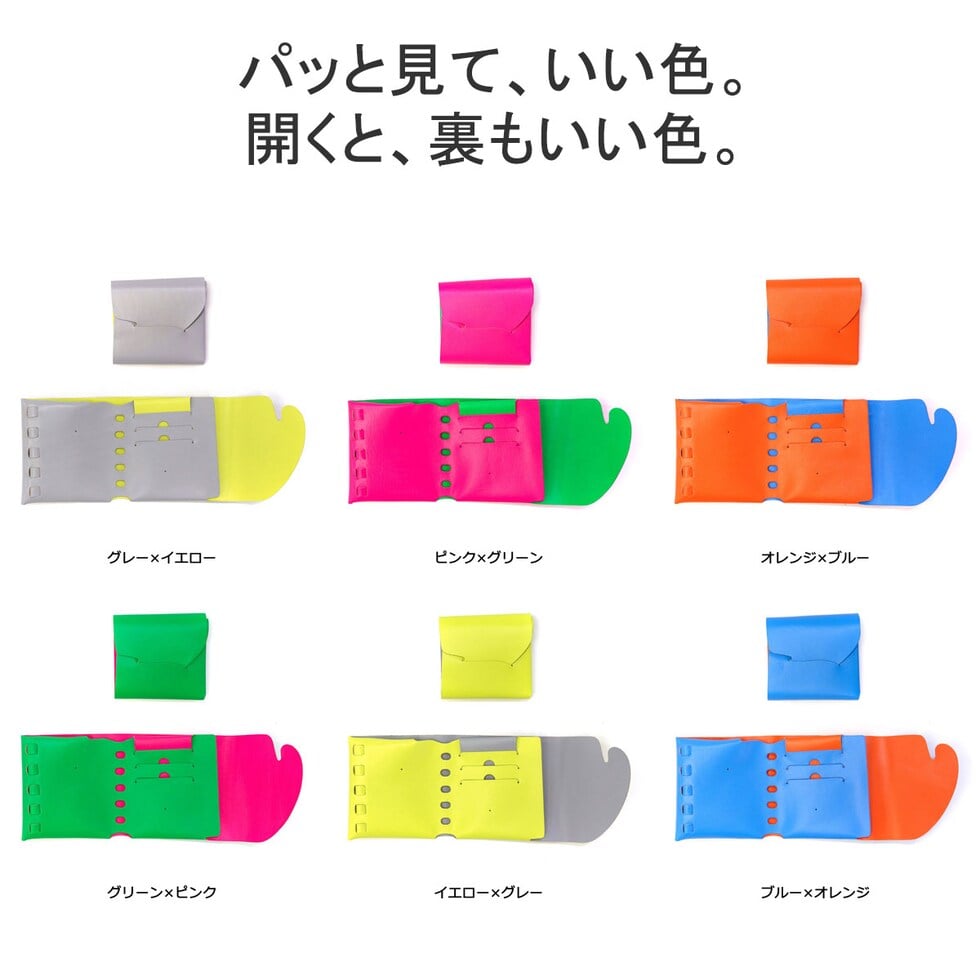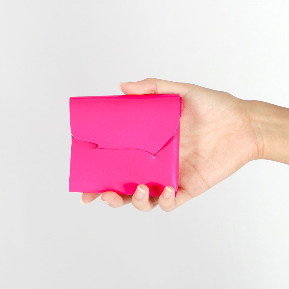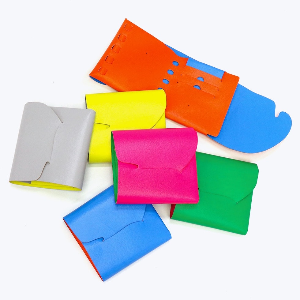 ネオンカラーを表裏にペイントした両面カラーのあたらしいコンパクト財布。横から裏のカラーがさりげなくのぞくのもポイントで、思わず眺めたくなる仕上がりになっています。「実は革である」と人に言いたくなるアイテム。革の魅力を閉じ込めているような、それでいて活かしているような不思議で新しいワクワクをお楽しみください。
