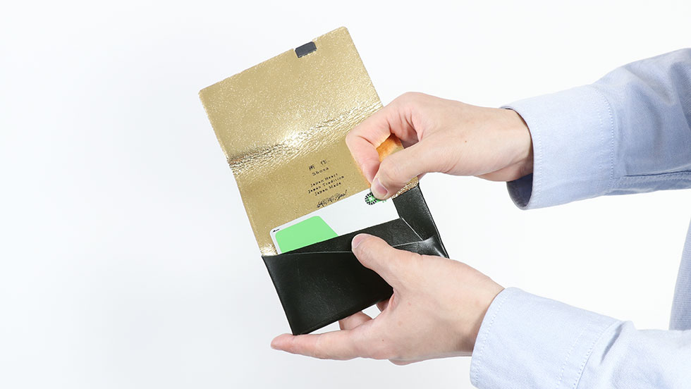 日本伝統の「折形」の紙が重なるディテールをデザインに落とし込んだカードケース。中身を取り出す際の仕草や動作などの「所作」を美しくみせるアイテムです。開いた時に裏箔から輝く光沢感が華やかさを演出してくれます。