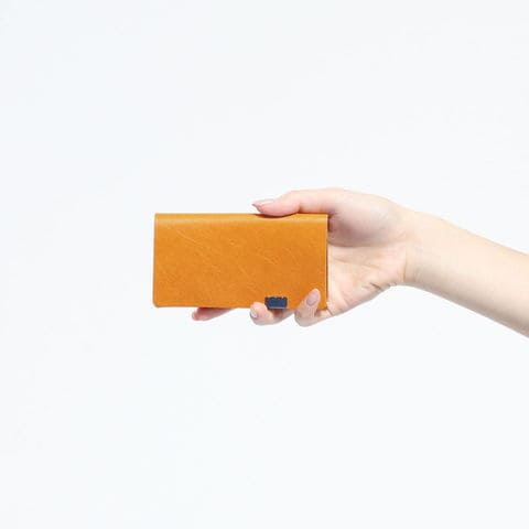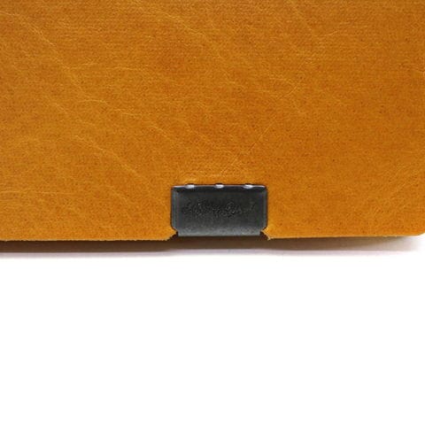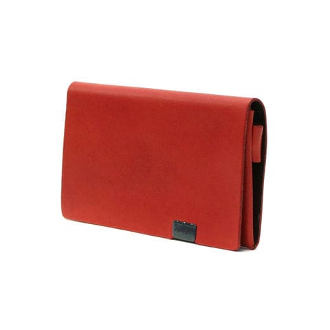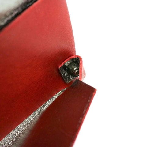 「袱紗(ふくさ)」をモチーフにし、上質な一枚革を折って成形。縫わずに最後に1点をボルト&ナットで留め付けるだけという、日本の美学が表現されたデザインです。ファスナーやボタンを使わず、レザー本来の風合いを最大限に活かしています。