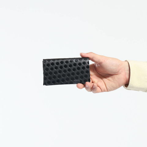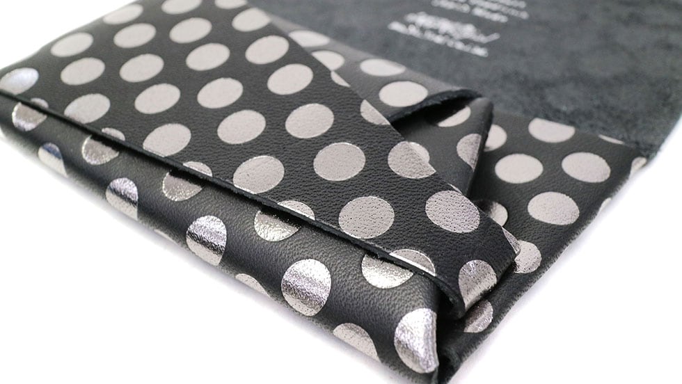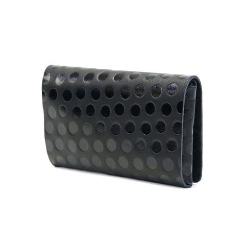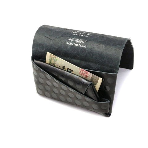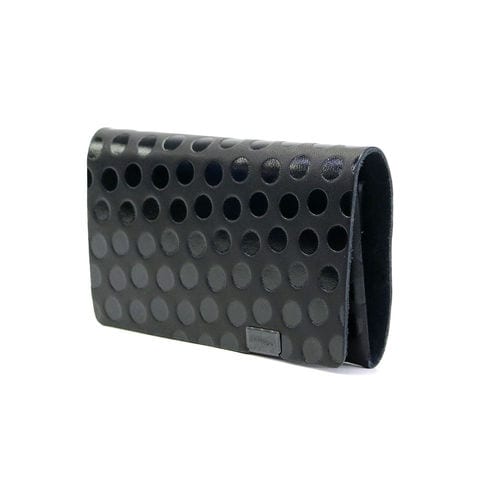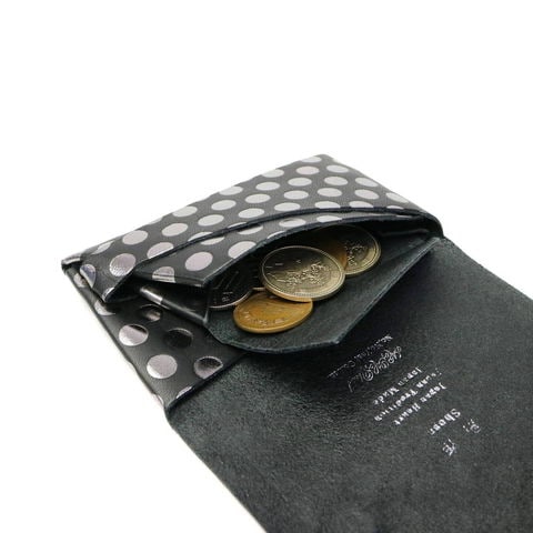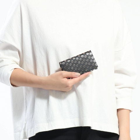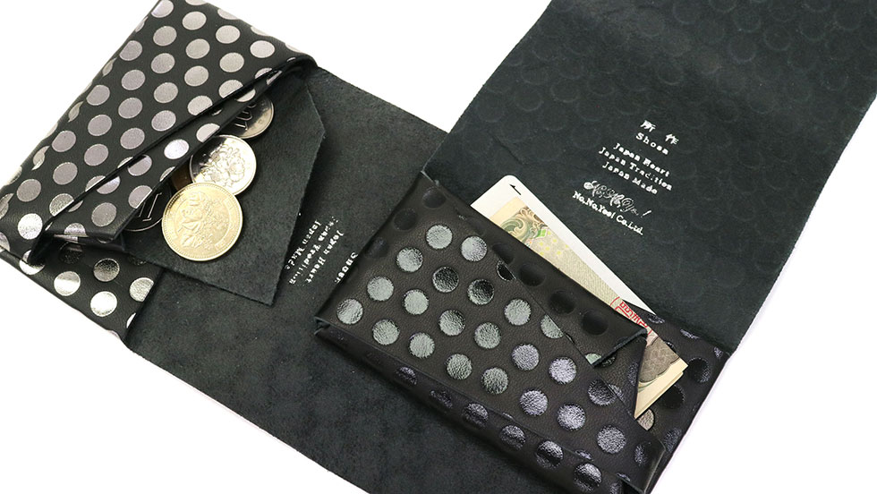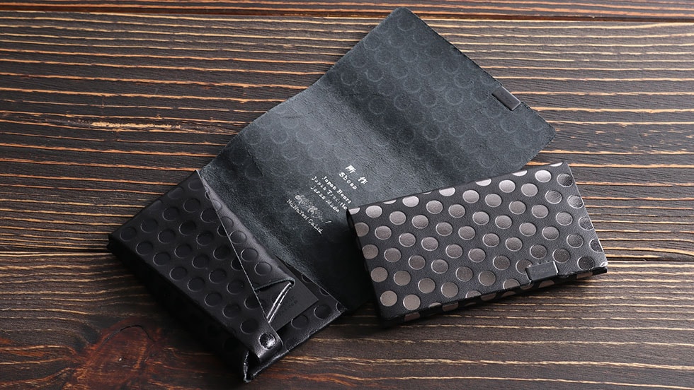 日本伝統の「折形」の紙が重なるディテールをデザインに落とし込んだコインケース。水玉模様の箔を加工したシリーズで、凹凸感のある独特な感触は、男性にも使いやすい、ポップでありハードでもあるデザインに仕上がっています。
