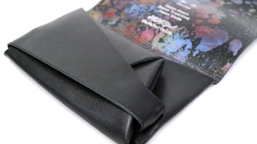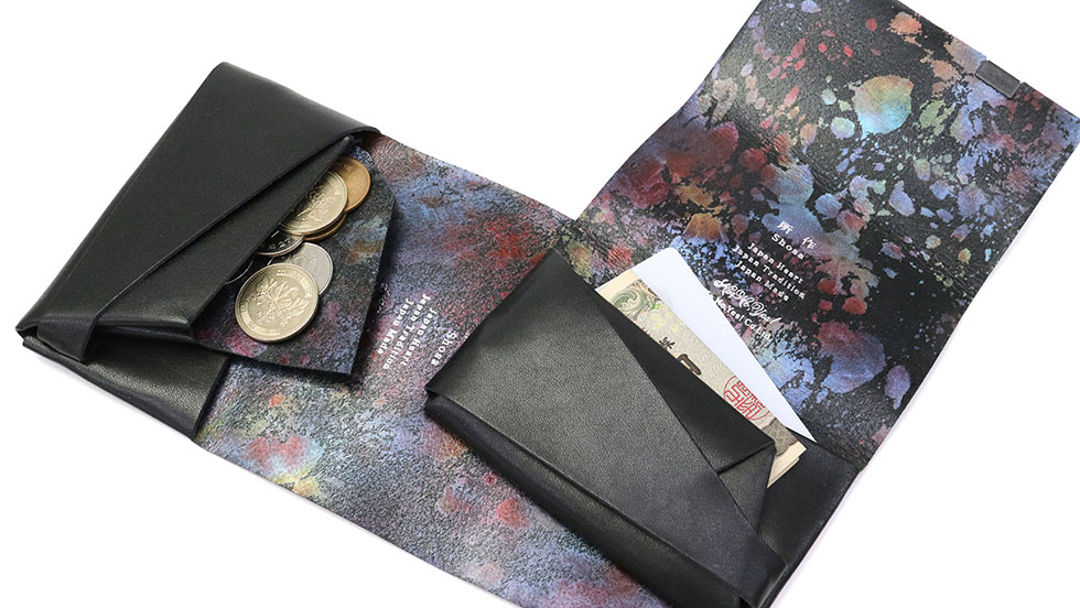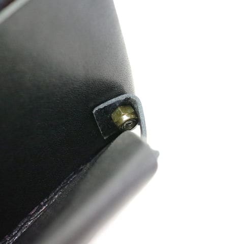 「袱紗(ふくさ)」をモチーフにし、上質な一枚革を折って成形。縫わずに最後に1点をボルト&ナットで留め付けるだけという、日本の美学が表現されたデザインです。ファスナーやボタンを使わず、レザー本来の風合いを最大限に活かしています。