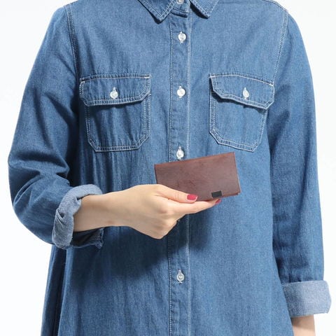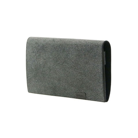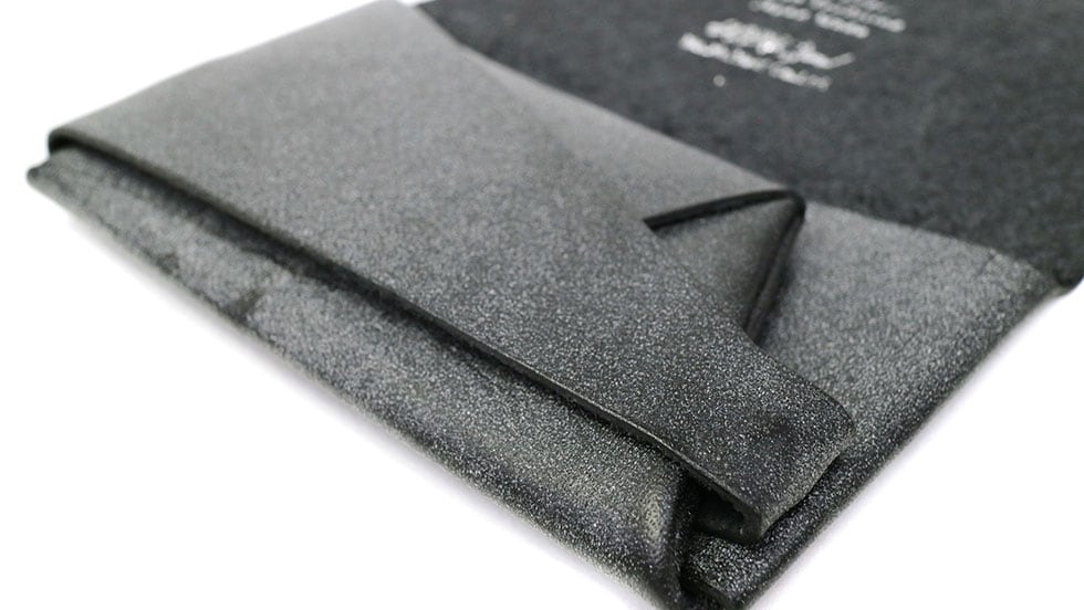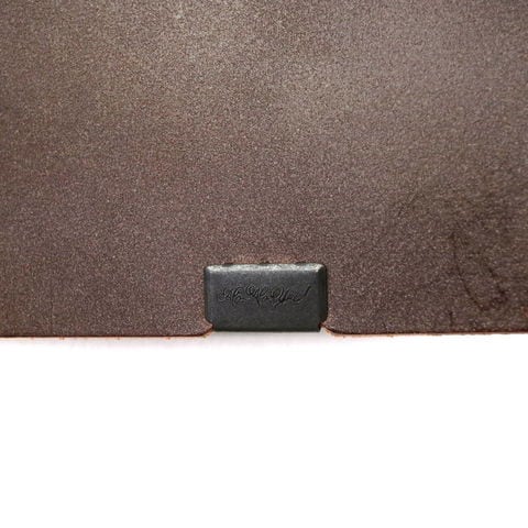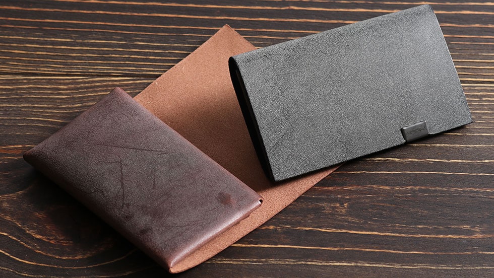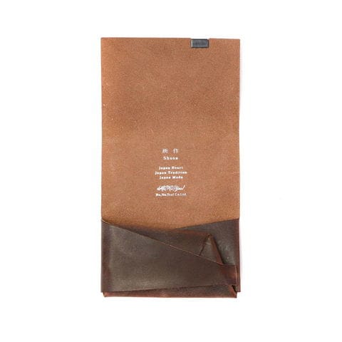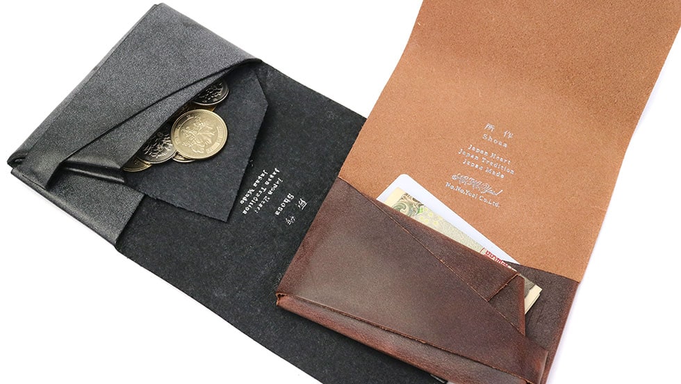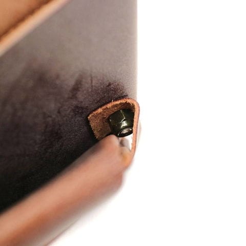 「袱紗(ふくさ)」をモチーフにし、上質な一枚革を折って成形。縫わずに最後に1点をボルト&ナットで留め付けるだけという、日本の美学が表現されたデザインです。ファスナーやボタンを使わず、レザー本来の風合いを最大限に活かしています。