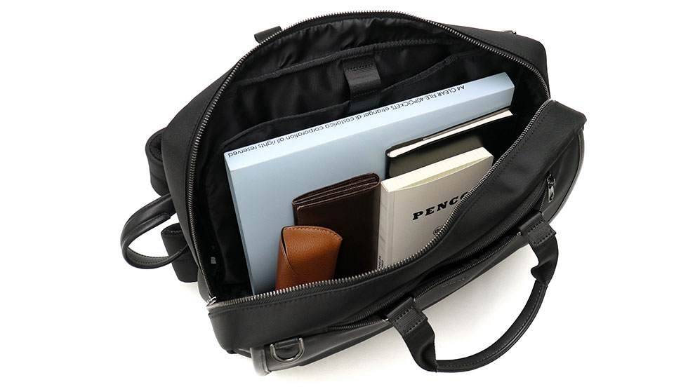 メインルームは書類をゆったりと収められるB4対応サイズ。L字ファスナーの収納口で荷物の取り出しがスムーズです。PC収納部やポケットを複数備え、大切な書類との仕分け管理もしっかり行えます。