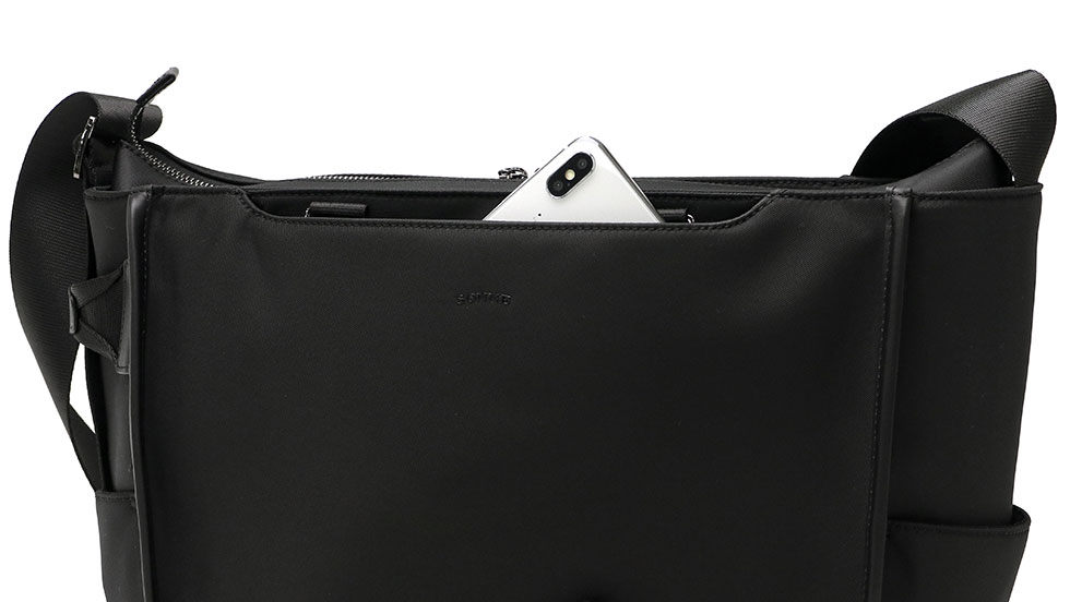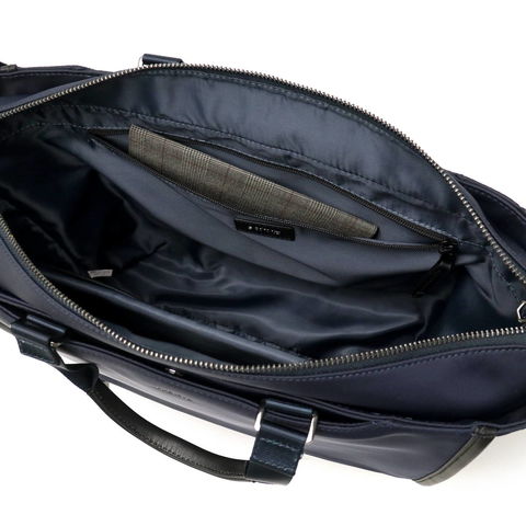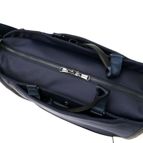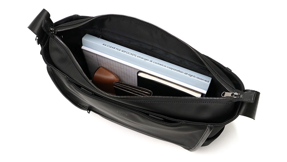メインルームはA4書類をゆったりと収められるサイズ感。マチを備えたデザインでしっかり自立するため、荷物整理や出し入れをスムーズに行えます。収納口はファスナー仕様で、荷物が飛び出してしまう不安を軽減しました。