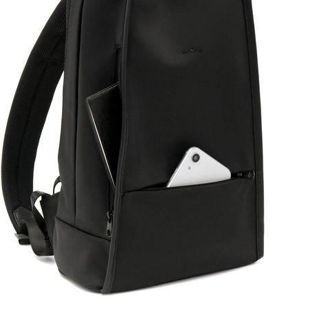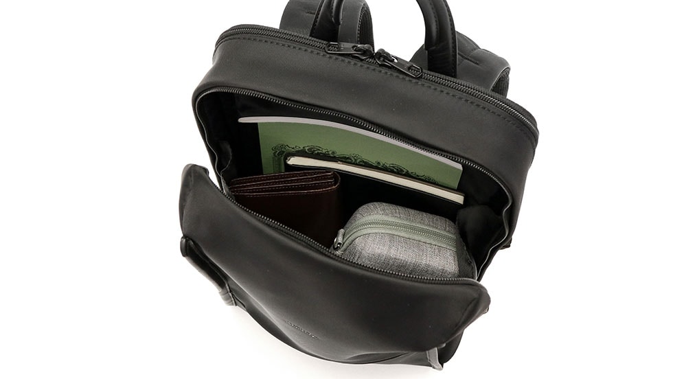 コンパクトな見た目ながら、A4書類を収められる使い勝手の良いサイズ感。また、荷物の仕分けに便利な2ルーム仕様であることもポイントです。前面収納部はマチ幅が広く、ペットボトル等も余裕で収められるなど、見た目以上に収納力が備わります。