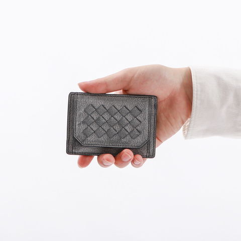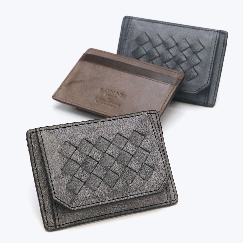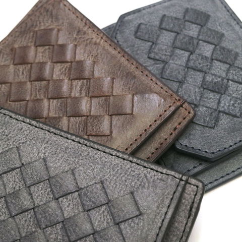 イタリアの名門タンナーである、TEMPESTI社のロウ引きのレザーを網目状に編み込んだレザー・メッシュを使用したコレクション、SIBILLA(シビラ)。こちらは、定期など、カードも収納できるポケットがついたコインケース。使用していくと摩擦で表面のロウが変化していく本体素材は、独特の風合いを醸し出すため、じっくりと経年変化をお楽しみいただけます。