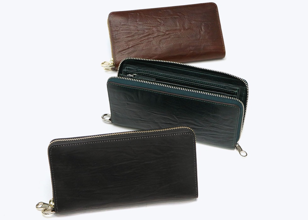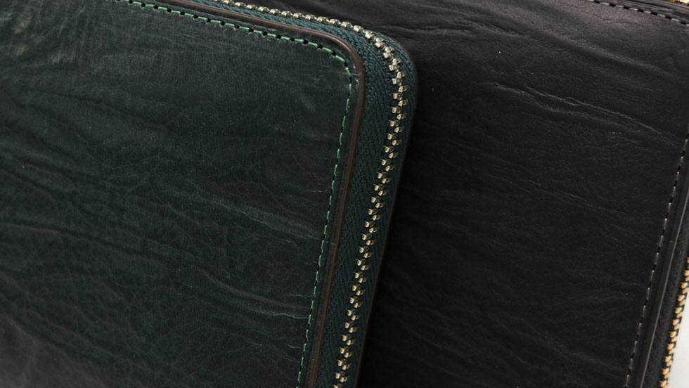 多大な時間をかけ、牛脚油でたっぷりと革に加工するバケッタ製法で仕上げたレザーは、革の表情がダイレクトに表現されます。また、加脂したオイルが抜けにくく、使い込んだときに独特の色艶が出てくる点も魅力の1つ。また、手作業で絞り染色することによってできる深いシワ感と色むらが特徴的です。
