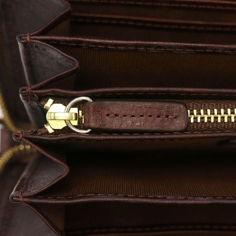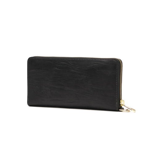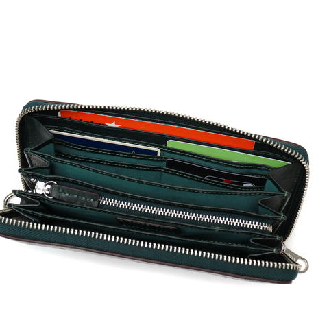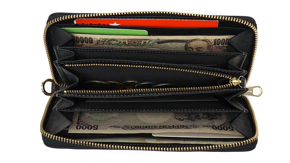 ラウンドファスナータイプで視認性に優れた内装。留め具のない長財布とは異なり、アイテムをたっぷり入れてもパカパカせずすっきりとお持ちいただけます。内部には札入れが4ケ設けられ、金額別の仕分け管理はもちろん領収書の管理などにも役立ちます。また、中央にはL字ファスナータイプの小銭入れを装備。