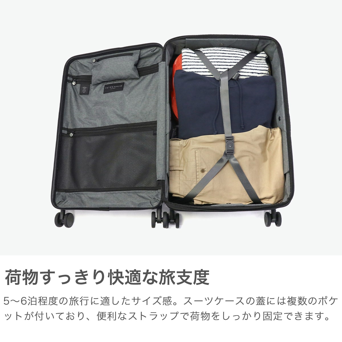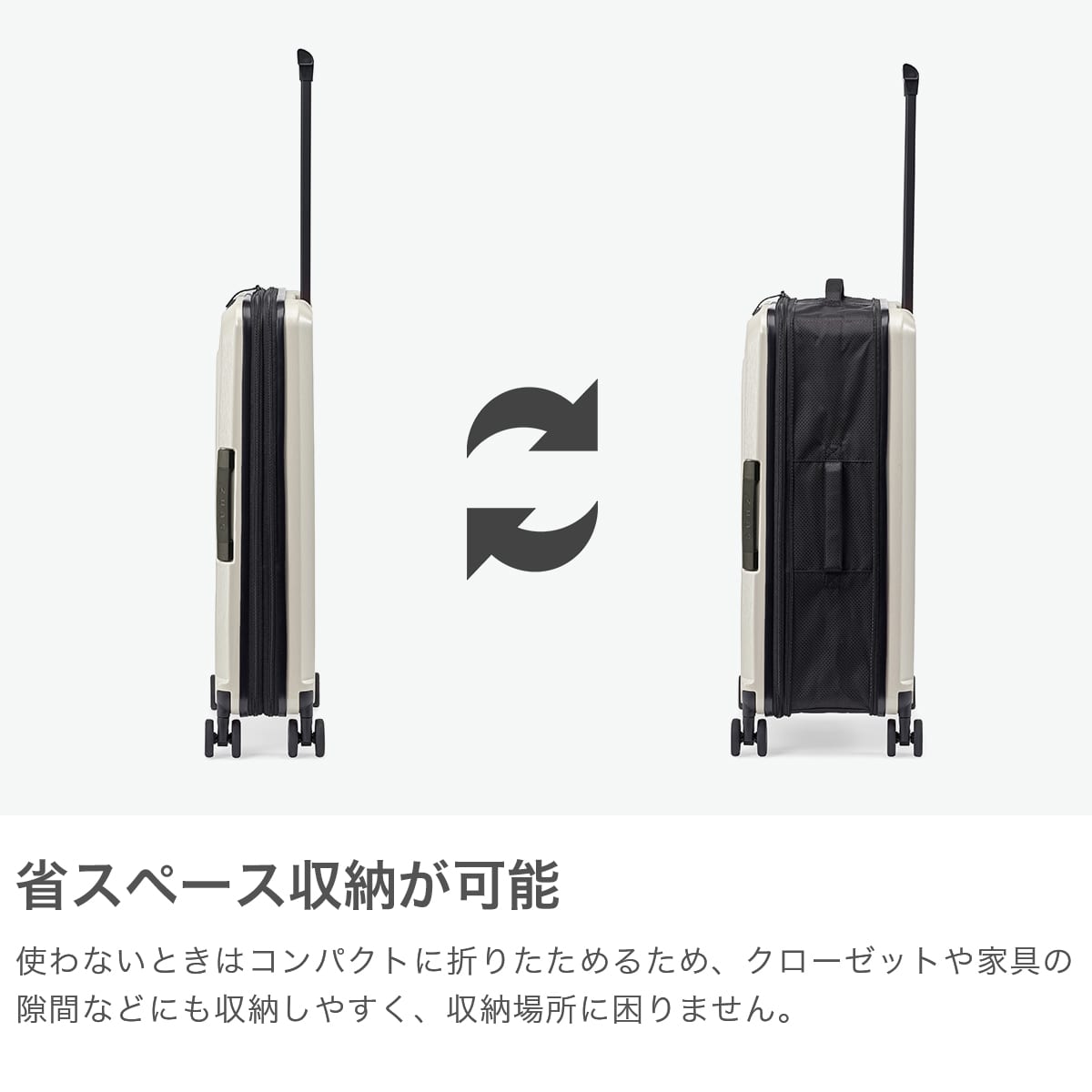 旅行時には大きく使え、保管時にはコンパクトにまとまる、60L容量のスーツケース。折りたたむと幅がわずか12.5cmとなり、収納スペースを取りません。スタイリッシュなデザイン性に加え、軽量ながら耐久性が高く収納力にも優れた高機能なアイテムです。