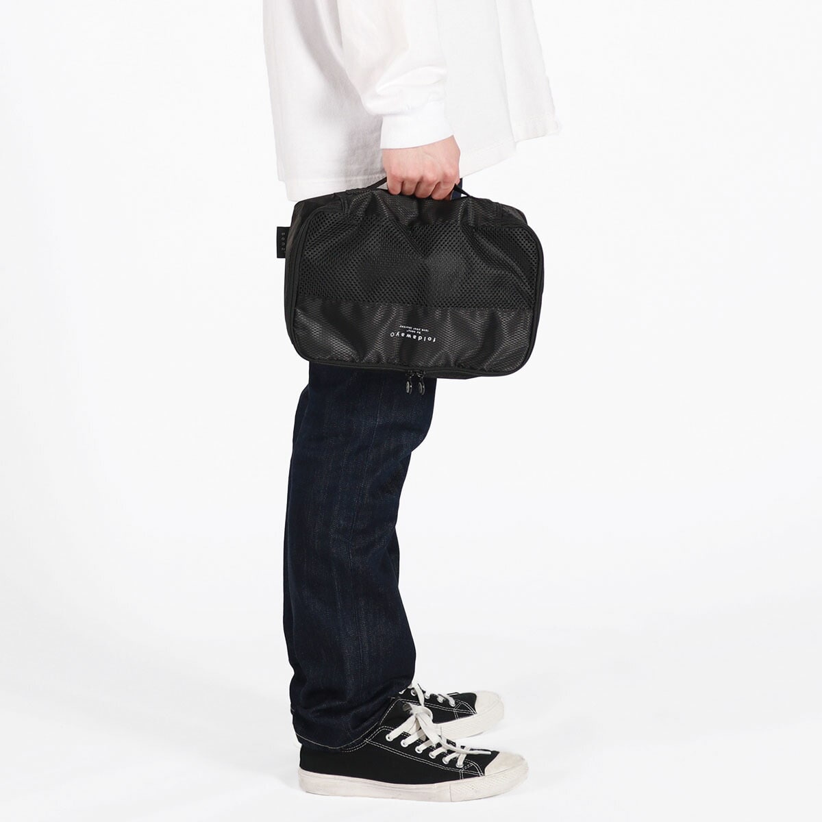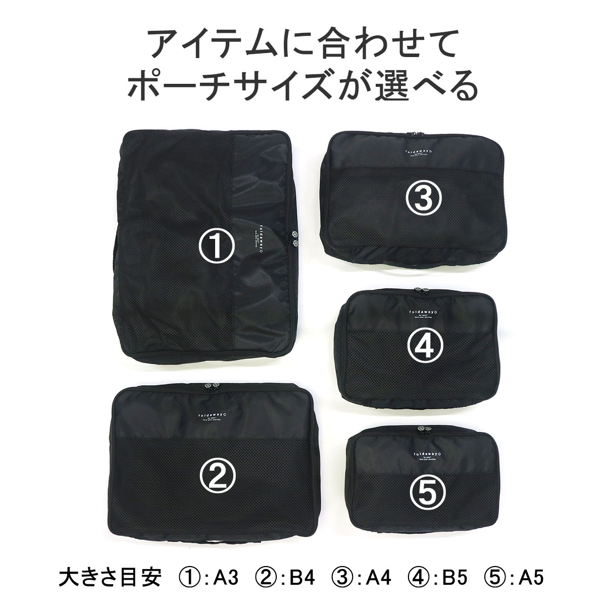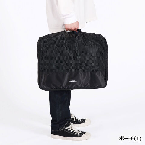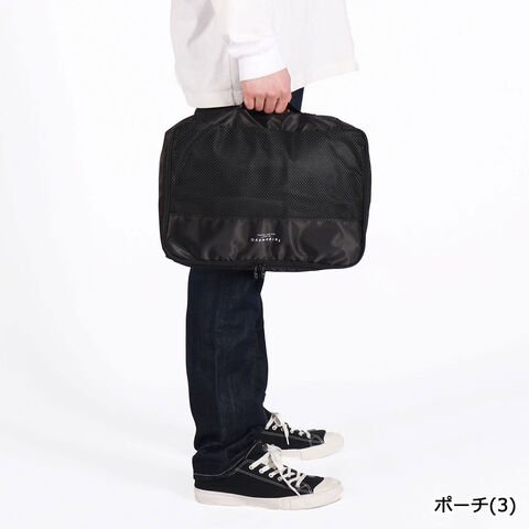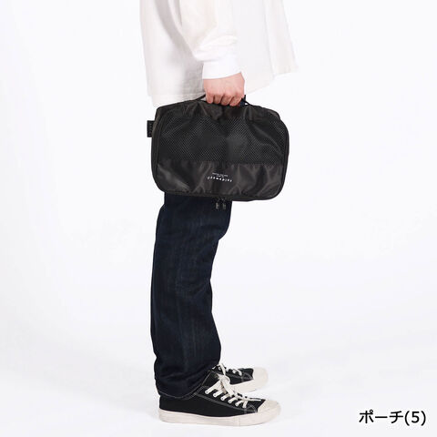 用途に合わせて荷物を仕分けできるポーチ5点セット。本体はフロントがメッシュ仕様になっているため、中身が一目でわかりやすく、通気性にも優れています。またダブルファスナーで大きく開く設計や便利なハンドルが付いており、パッキングや荷物の出し入れをサポートする細部の機能的な造りもポイントです。