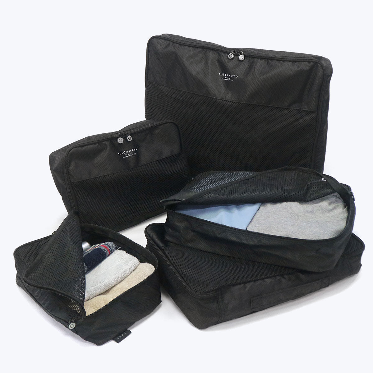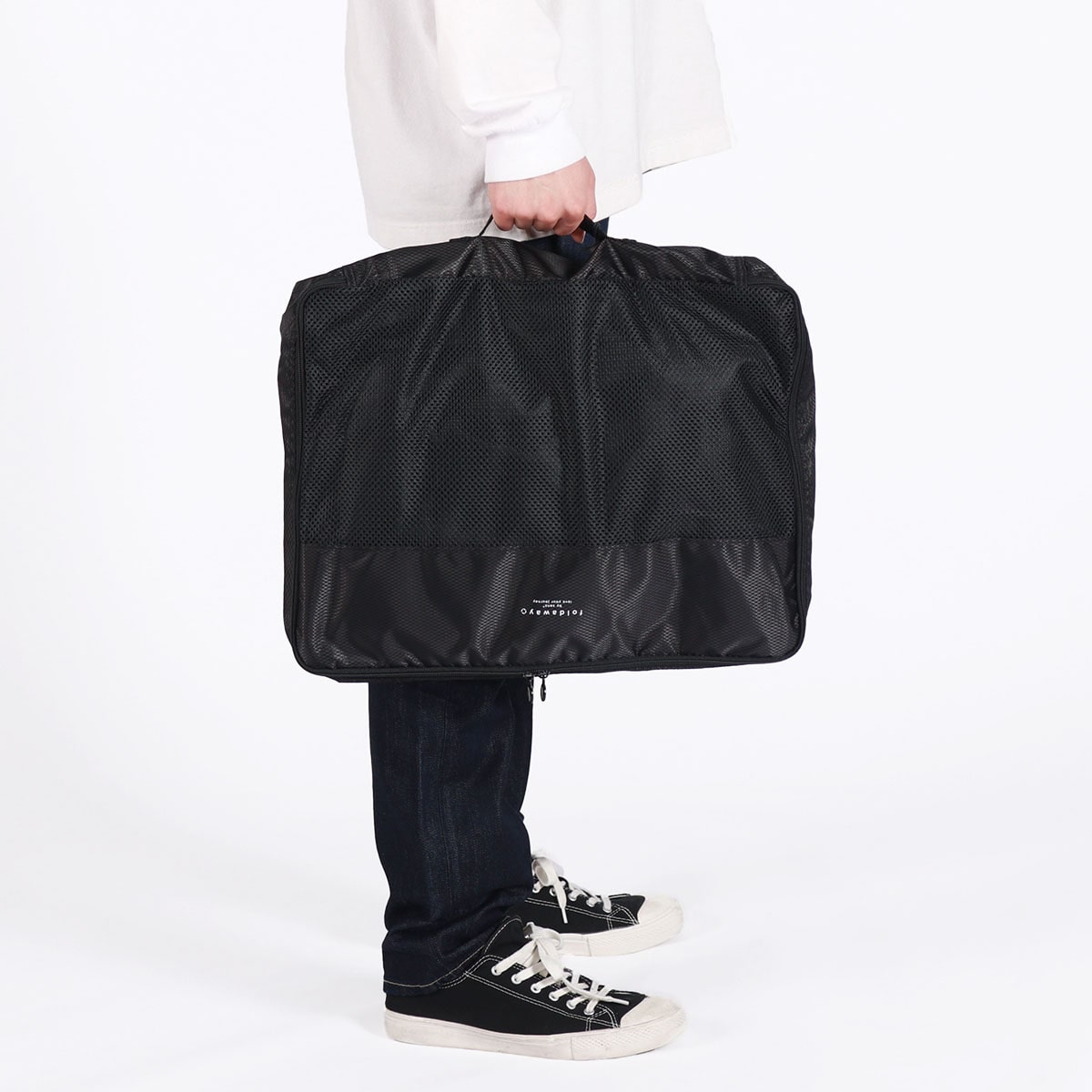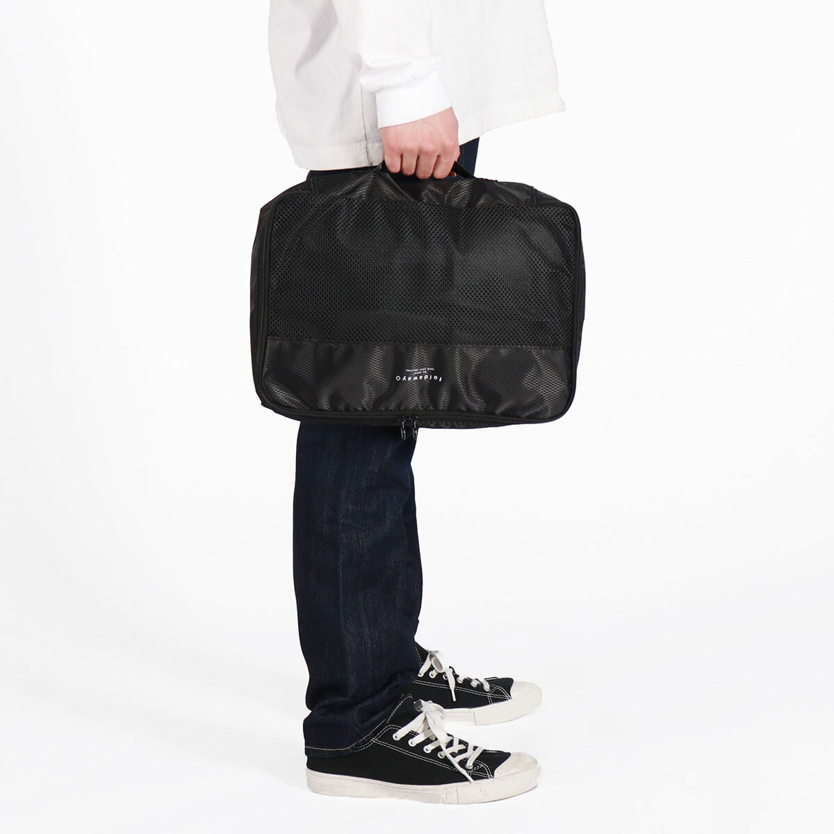用途に合わせて荷物を仕分けできるポーチ5点セット。本体はフロントがメッシュ仕様になっているため、中身が一目でわかりやすく、通気性にも優れています。またダブルファスナーで大きく開く設計や便利なハンドルが付いており、パッキングや荷物の出し入れをサポートする細部の機能的な造りもポイントです。