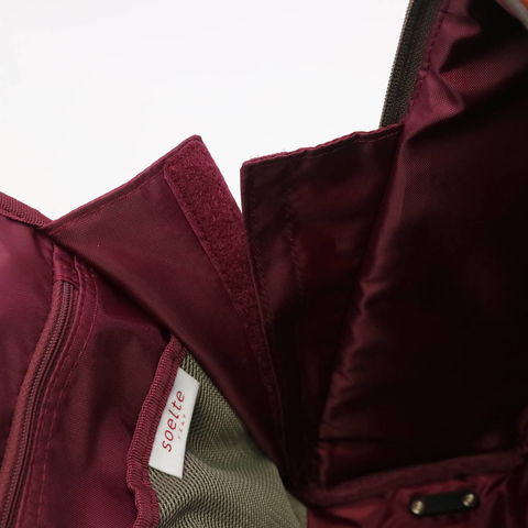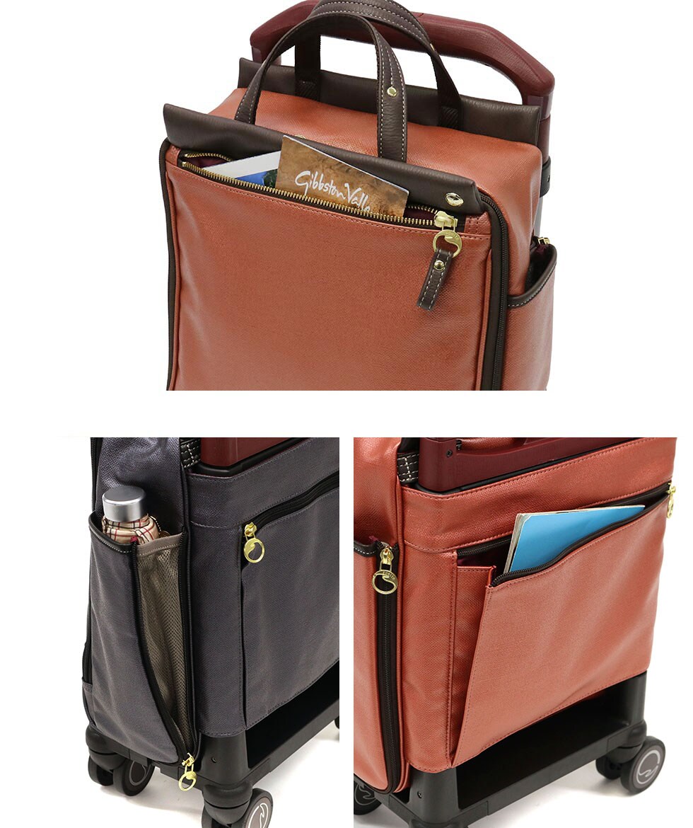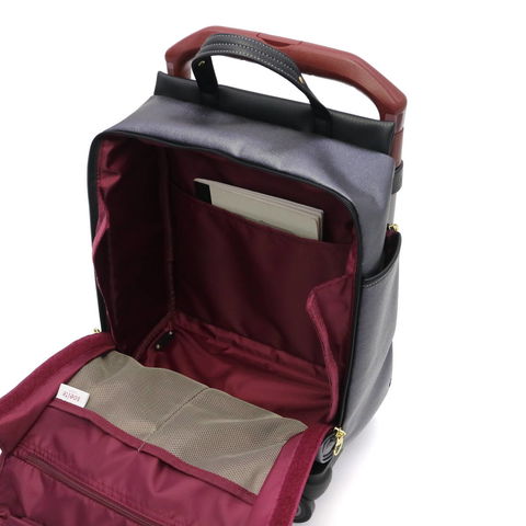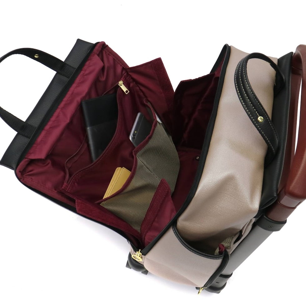 収納部は、容量12Lで普段使いや日帰り旅行に最適のサイズ感。内部には小分けに便利なポケットも複数装備しています。また、開口部はファスナー開閉で大きく開き、荷物が見つけやすく取り出しやすい作りです。さらに、バッグ部分は着脱が可能になっており、ハンドバッグ単体としてもお使いいただけます。