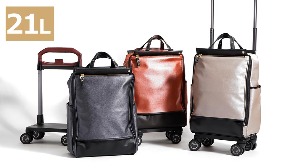いつものオシャレを邪魔しないカジュアルかつシンプルなデザインで、普段のお出かけにピッタリなキャリーケースシリーズ『カランド』。落ち着いたカラー展開ですが、パール加工が施されているので、女性らしい華やかさもあるアイテムです。