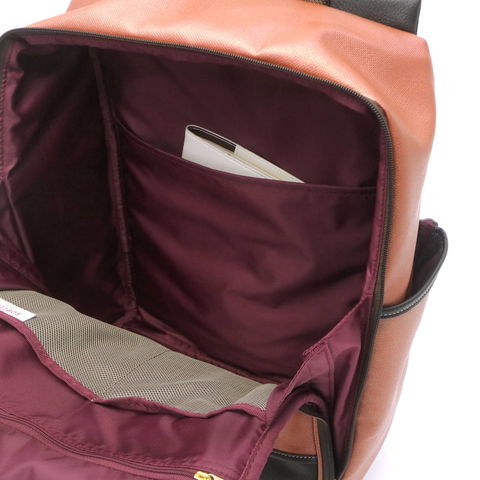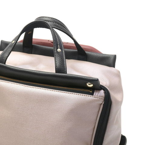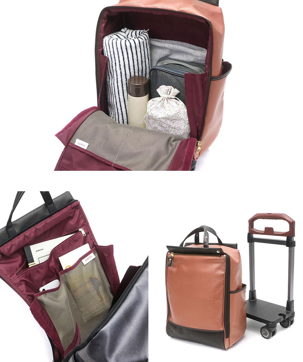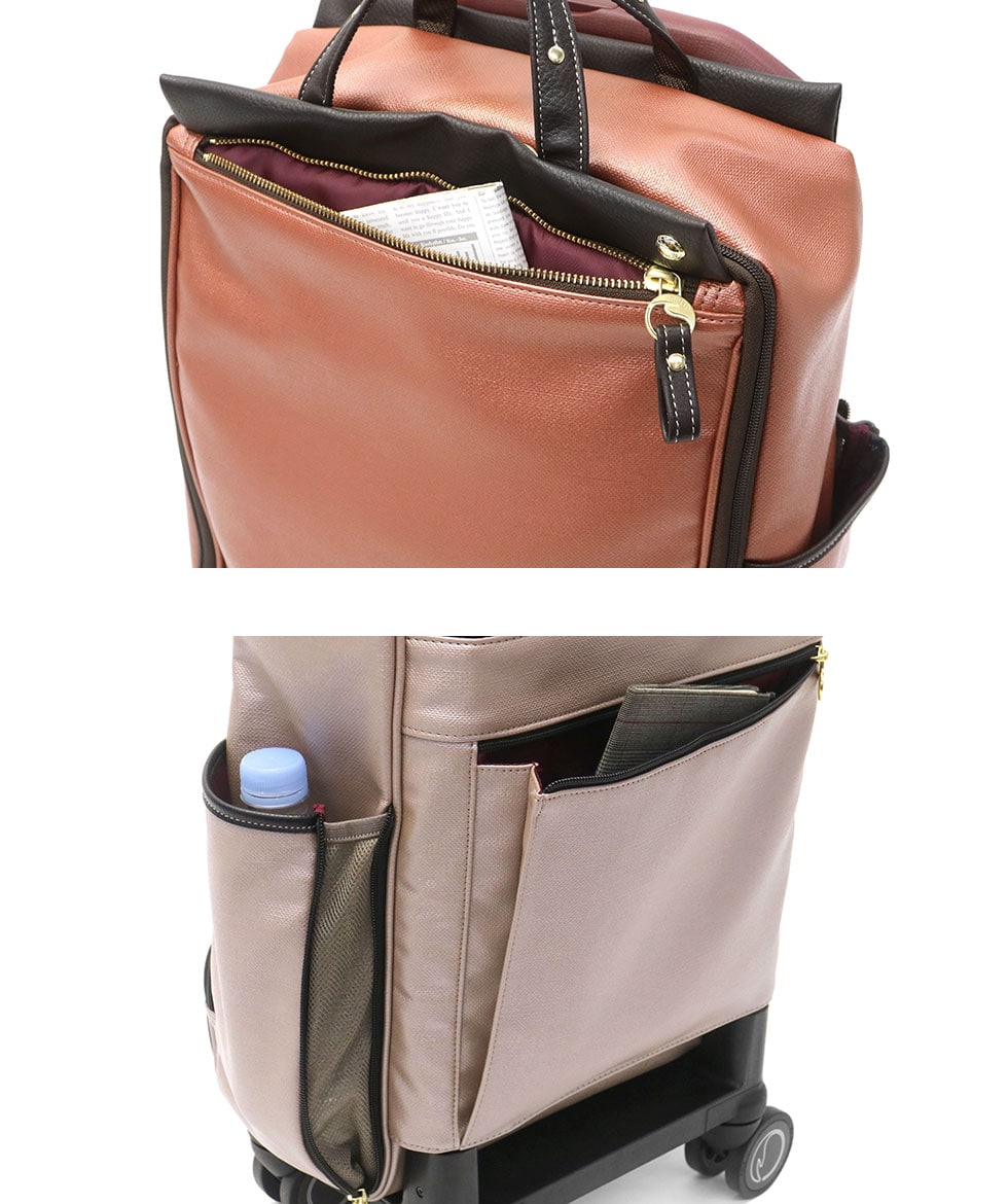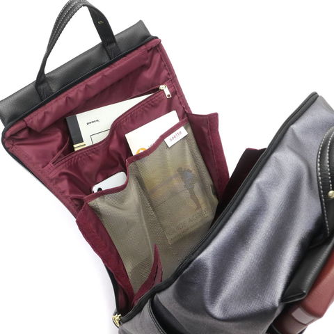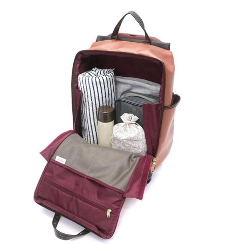 容量21Lの本体は、習い事や日帰り旅行に最適。着替えや道具がすっきり収まります。収納口が大きく開き、荷物の整頓がしやすいつくりです。小分けポケットも設けていますので、バッグ内で小物が散らばることもありません。さらに、バッグ部分は着脱できるので、ハンドバッグ単体としてもお使いいただけます。