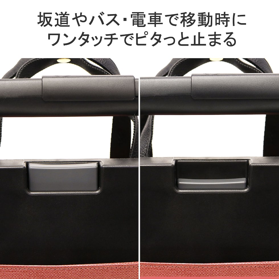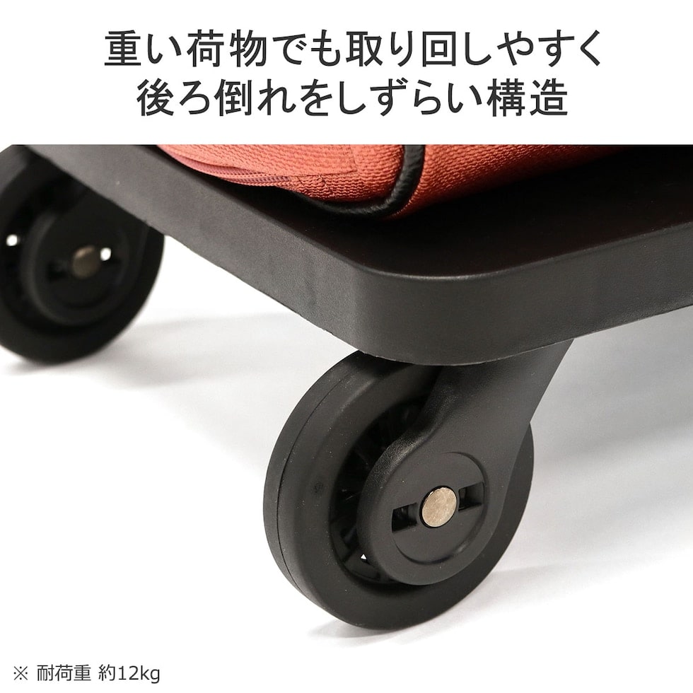 電車やバスの移動時など、不意な転がりをワンタッチで止めることができる「キャスターストッパー機能」を搭載したデイリーカートです。段差の乗り越えがしやすい70mm径の単輪キャスターを採用し、移動もスムーズに。普段の気軽なお出かけにちょうど良い、シンプルなデザインも魅力的な仕上がりです。