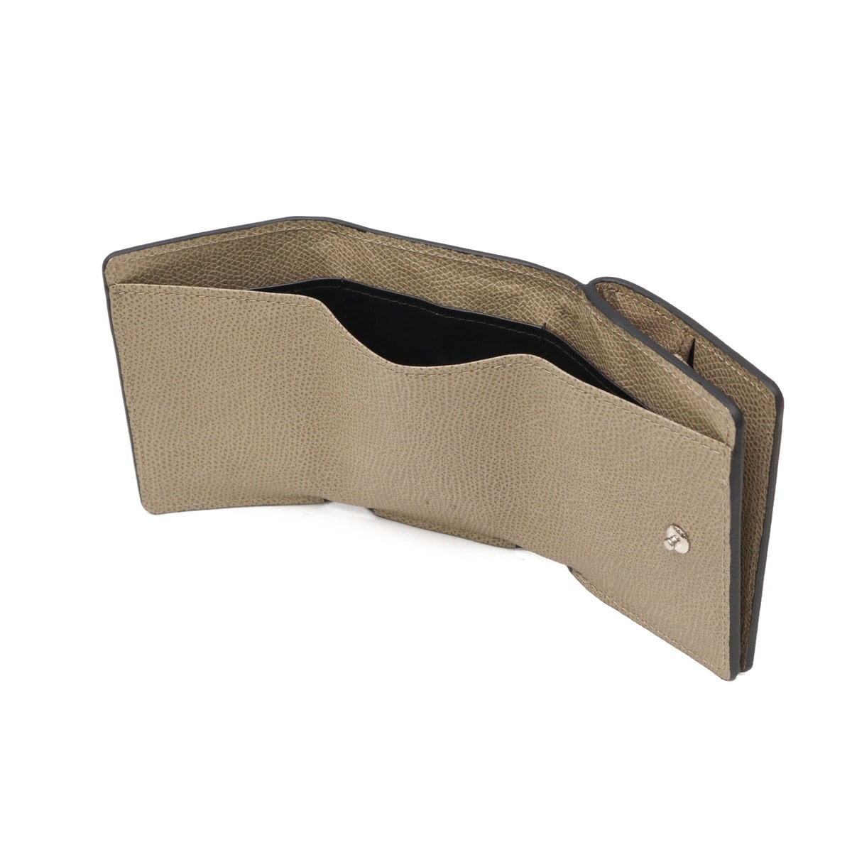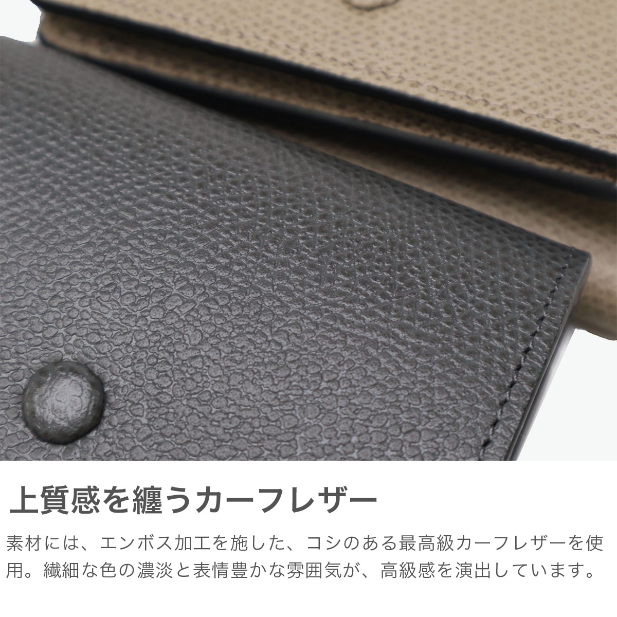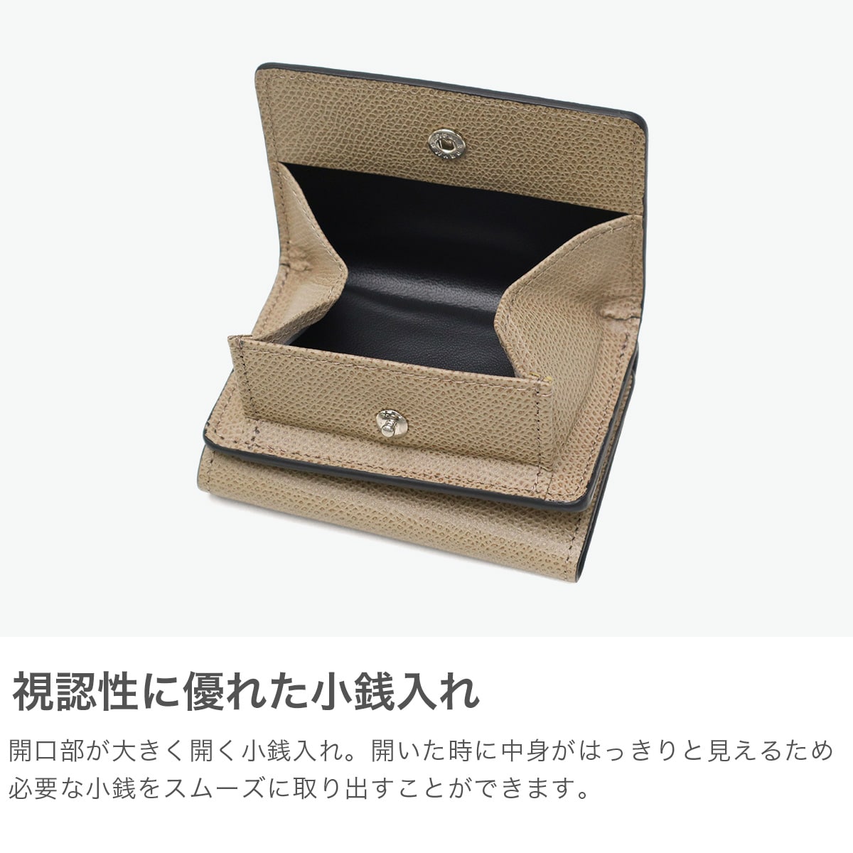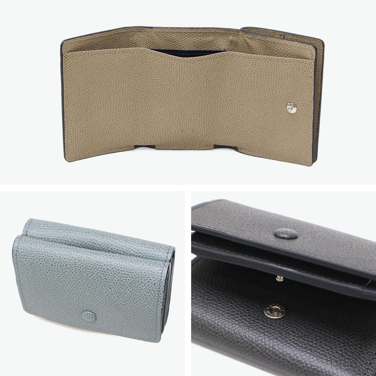 最高級のカーフレザーを使用した三つ折り財布。繊細なエンボス加工による豊かな表情と、キズが目立ちにくい丈夫さが魅力です。手のひらに収まるコンパクトなサイズ感で、小さめのバッグやポケットにもすっきり収納できます。小銭入れは大きく開き、見やすく出し入れしやすい設計に。細部まで丁寧に仕立てた、高級感のある逸品です。