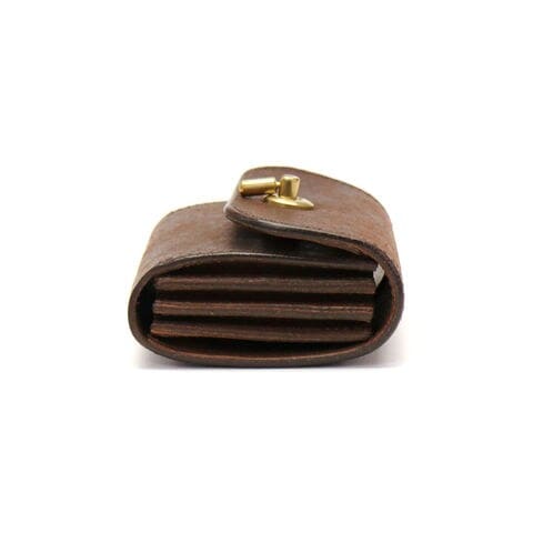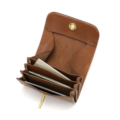 この財布は切り目仕立てになりコバ磨きの良し悪しが如実に出る作りになっています。何度もコバを磨き続けることで角が無くなり丸みのある風合いになり耐性も増します。財布のクオリティを見る大きなポイントの1つと言われ、まさに丁寧さが際立つ箇所になります。また、凛とした佇まいの真鍮製金具を使い、全体を引き締まった印象にしてくれています。革と共に趣きのある表情に変化しますので、日々の暮らしの中で愛着を積み重ねてゆけます。