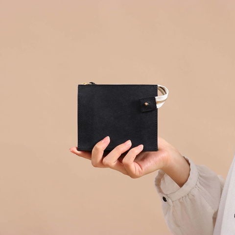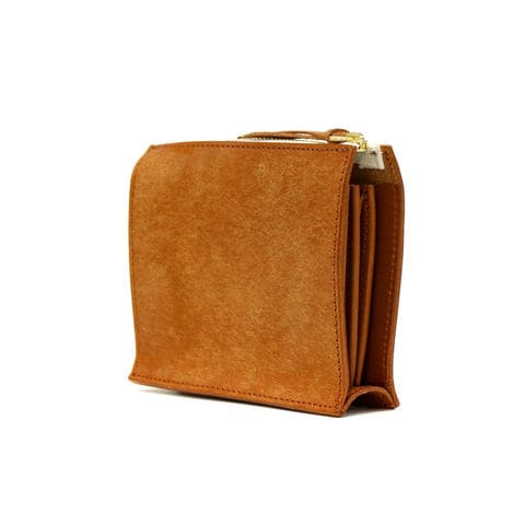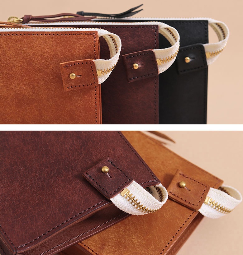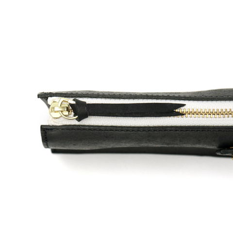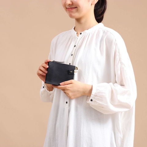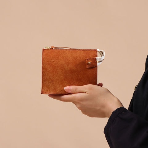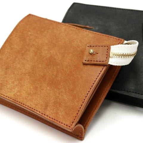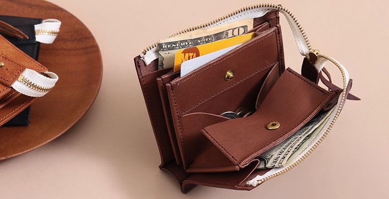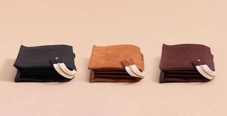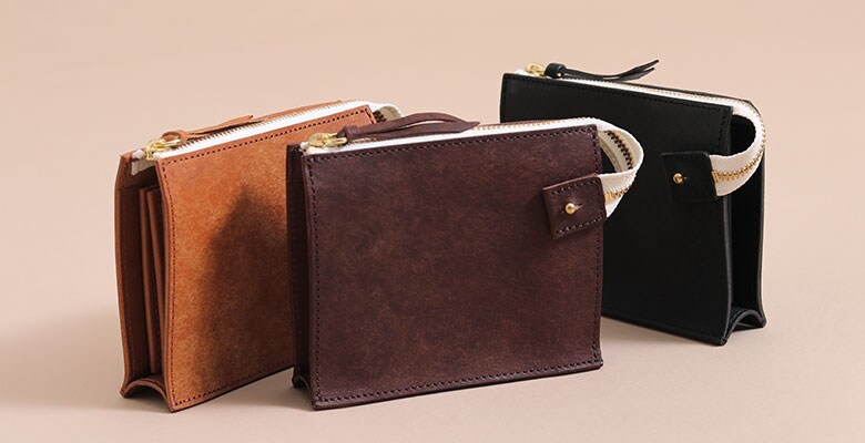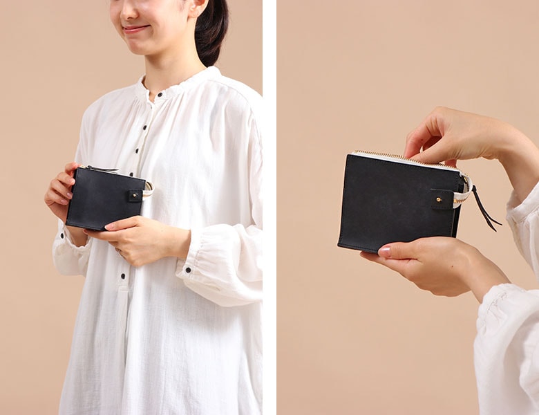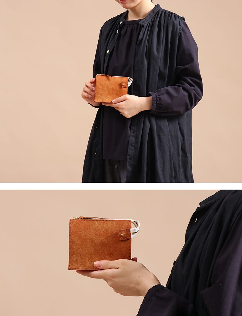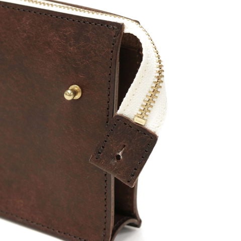 正面から見ると一般的な財布に見えますが、ダレスバッグのように側面と底面の革を別々に組み込むことで底が立つ独自構造になっています。ファスナーを開くと、サッと扇状に広がる端麗な姿に。その佇まいは、確かな技術を惜しみなく注ぎ、上質を求めた証でもあります。マットなプエブロレザーの質感と真鍮金具も相まって、凛と引き締まった雰囲気ある財布です。