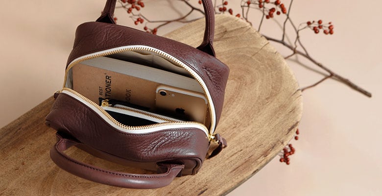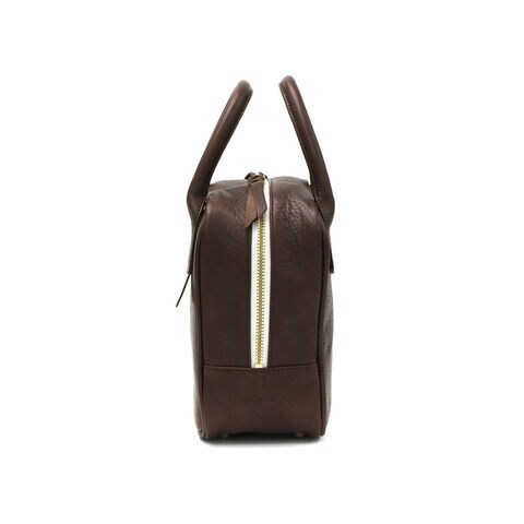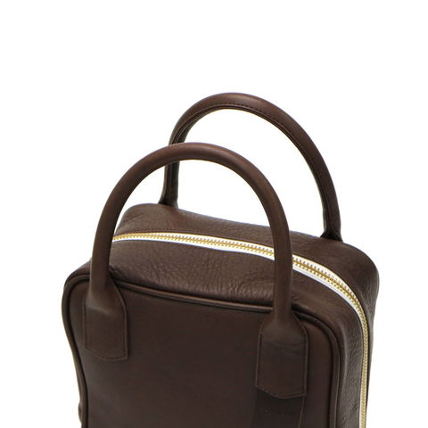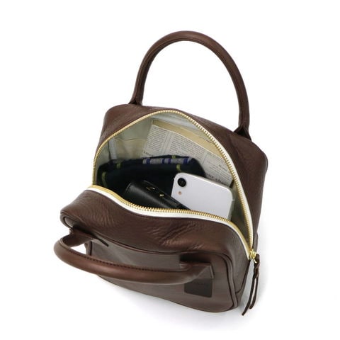 鞄自体は、机の上や膝の上にポンと置いても型崩れしないパイピング構造によって仕立てられています。収納口は左右どちらからでも開けられるダブルファスナー仕様で、ものの出し入れも容易です。芯入りの丸手型持ち手で手が疲れにくく、とっさに置いても真鍮製の底鋲がしっかりと鞄を支えてくれます。内装は、生成りコットン生地のナチュラルな雰囲気にまとめています。小さいながらも鞄としてあるべき本質と高い品質を追い求めた仕立てとなっています。