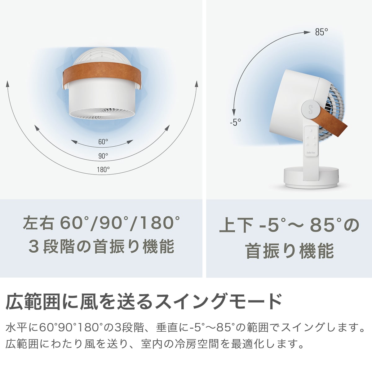 風量4段階調節、送風距離8m、自動3D首振り機能(水平スイングモード60°90°180°、垂直スイングモード-5°~85°)、ナチュラルブリーズモード、タイマー機能(1~7時間)