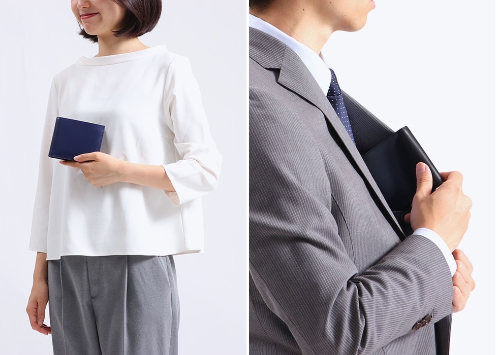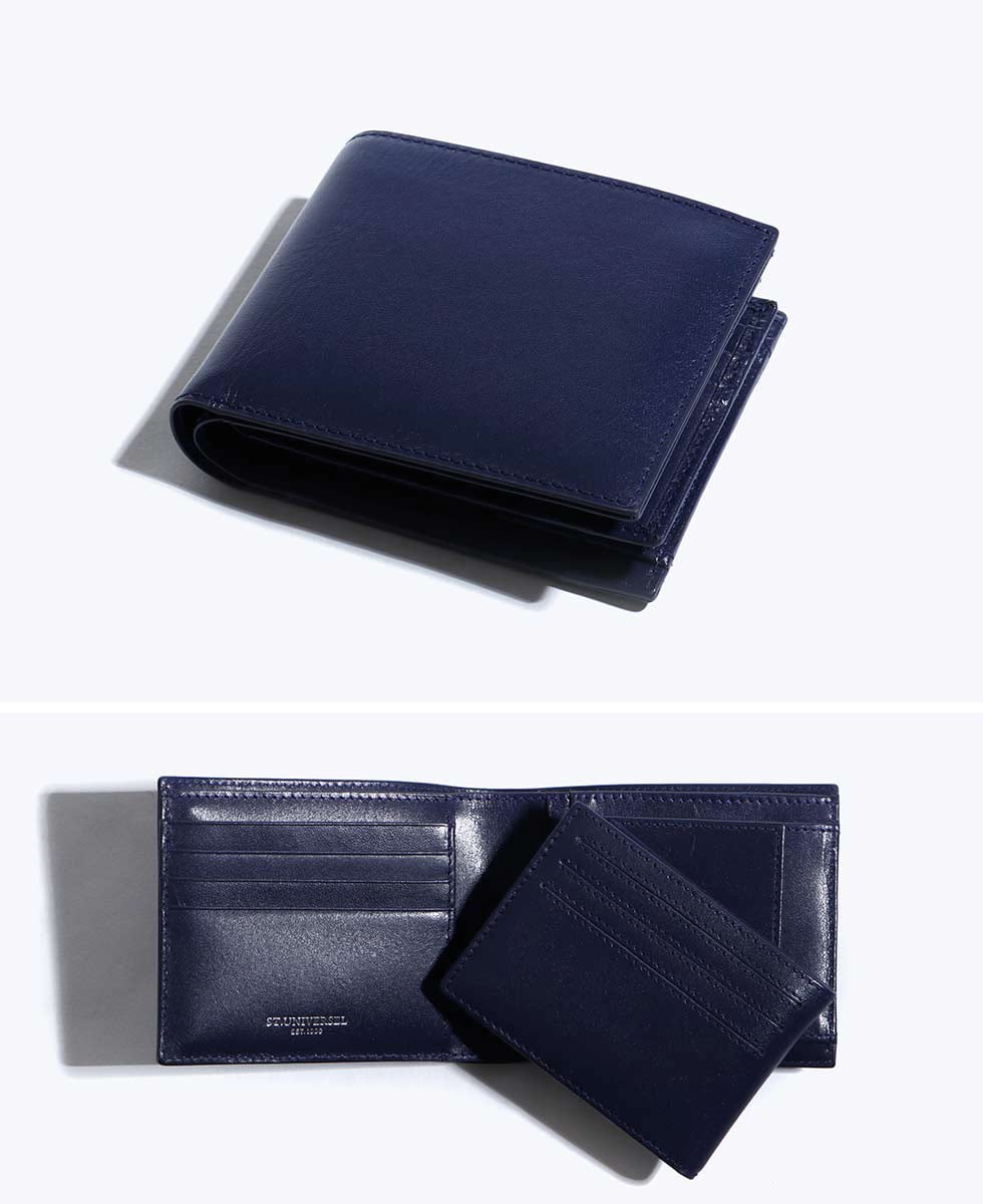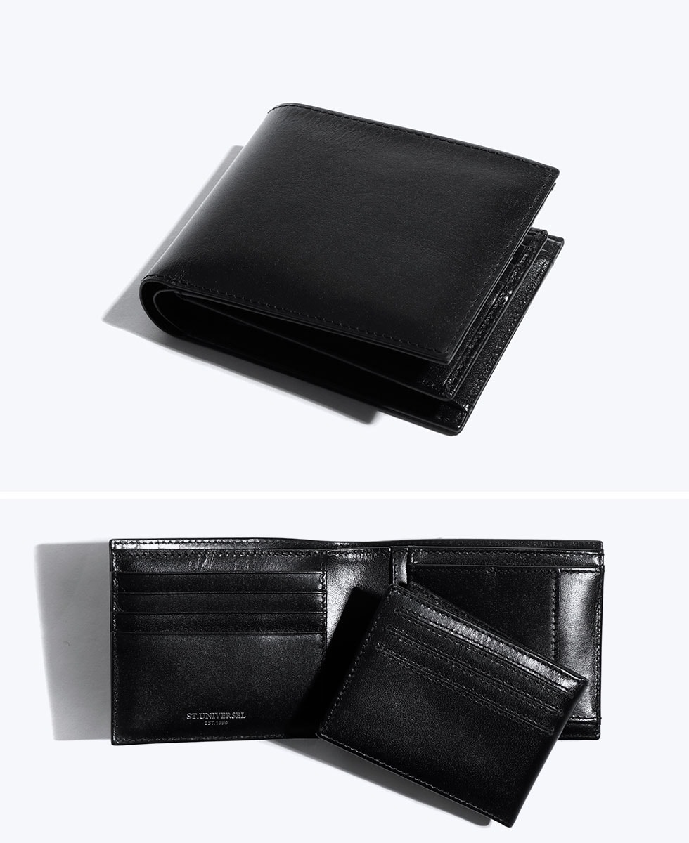 カード収納部分が脱着可能で財布とカードケースそれぞれ独立して使える二つ折り財布。艶やかなレザーを採用しシンプルに仕立てたミニマルなルックスです。使いやすさ抜群の収納設計と上品なルックスで、ご自身としてだけでなくギフトとしてもオススメです。