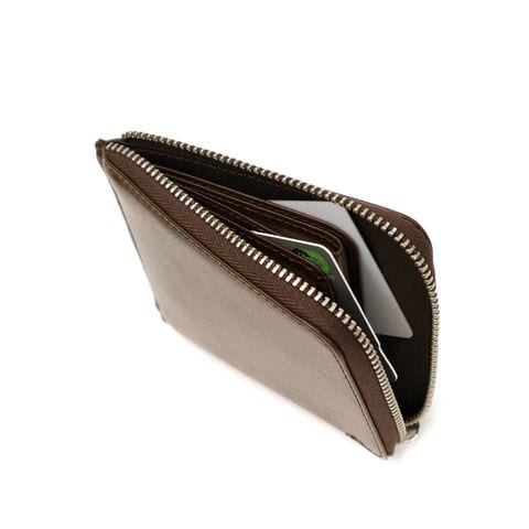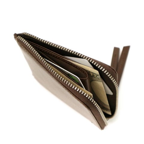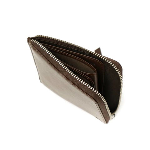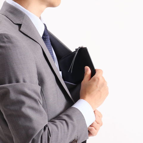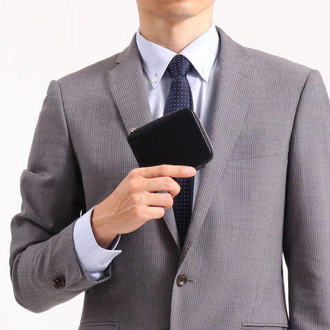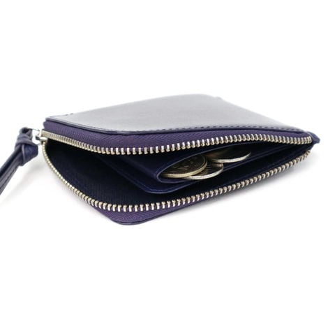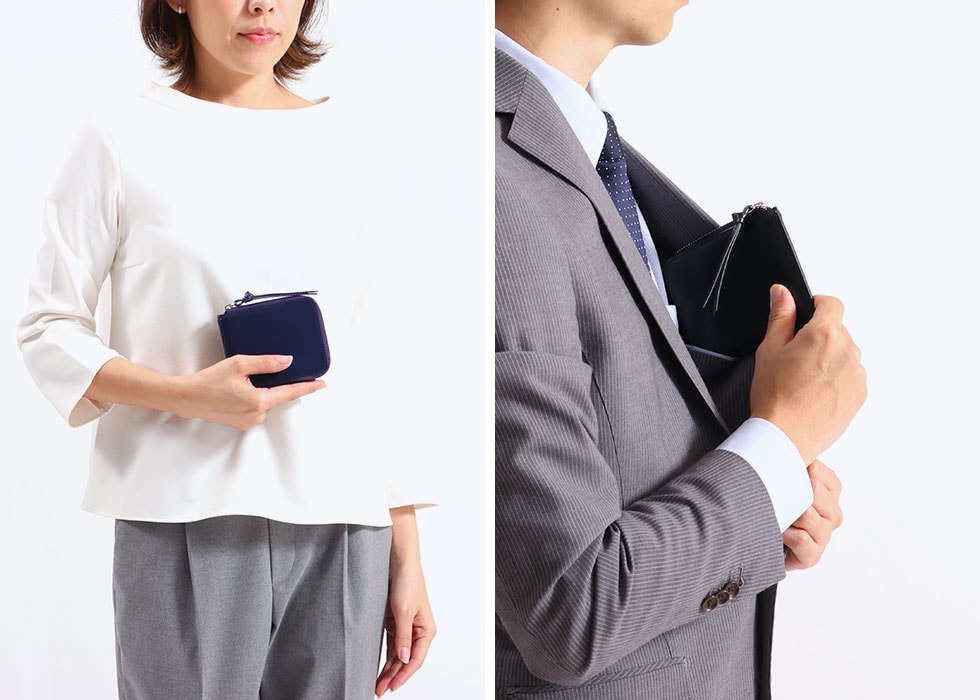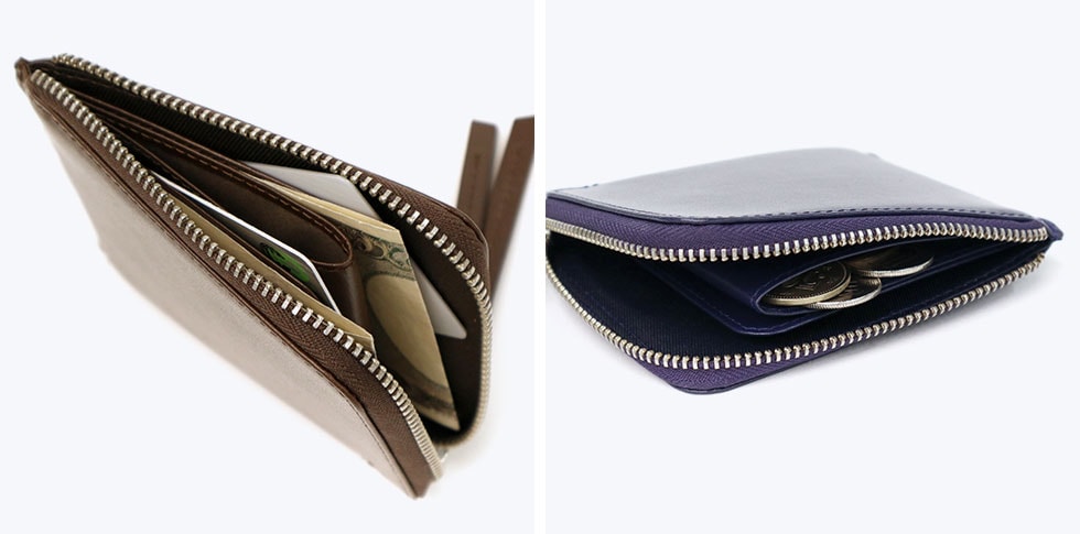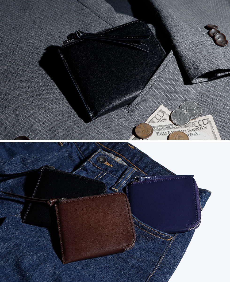 本体はスリムでポケットにもスムーズに入る薄マチデザイン。L字ファスナーでスムーズに開閉する収納部は、スマートなフォルムながら内側に仕切りとポケットを設け、二つ折りにした紙幣や小銭、複数のカードがスッキリと収まります。