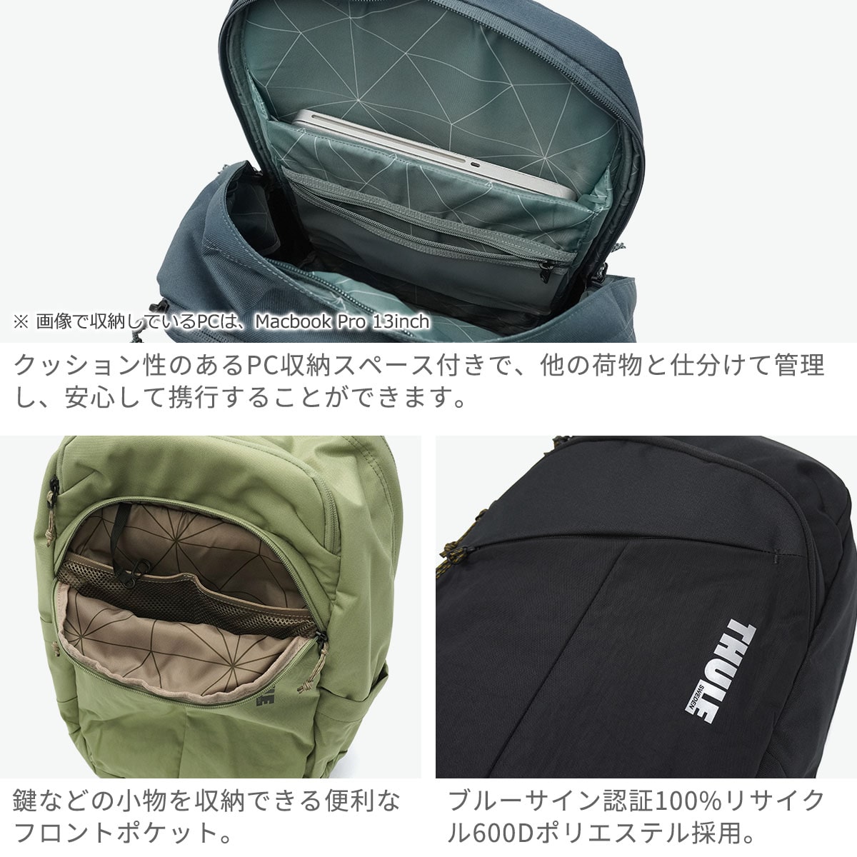 世界トップクラスのカーキャリアメーカー『THULE/スーリー』の28Lバックパック。当店でしか手に入らないモデルです。リサイクル素材を使用した環境に優しいbluesign認証の素材で、パッド入りのベースパネルやYKKファスナーなど、耐久性に優れたデザインを採用。内装生地を幾何学模様にするなど、ディティールにもこだわったアイテムです。ユニセックスでお使いいただけるほか、旅行・ビジネスなど幅広く活躍します。