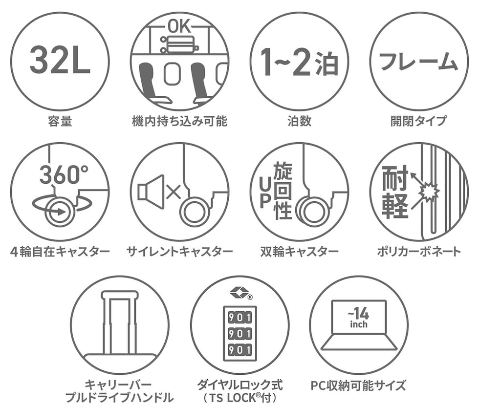 幅広いスタイルにマッチするデザインの「DARJEELING」シリーズ。本体は機内持ち込みに対応しており、300円コインロッカーにも収まるサイズ感。ボディには、軽量で高耐久なポリカーボネートを採用しているため、タフに活用できます。その他、ワンタッチプッシュでスムーズに開閉できるTSAロックを搭載するなど、旅をサポートする機能をしっかり備えたアイテムです。