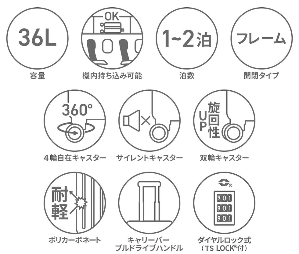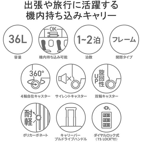 幅広いスタイルにマッチするデザインの「DARJEELING」シリーズ。機内持ち込みサイズの本体は、1~2泊程度の出張や旅行に適したコンパクトなモデルです。ボディには、軽量で高耐久なポリカーボネートを採用しているため、タフに活用可能。その他、ワンタッチプッシュでスムーズに開閉できるTSAロックを搭載するなど、旅をサポートする機能をしっかり備えたアイテムです。