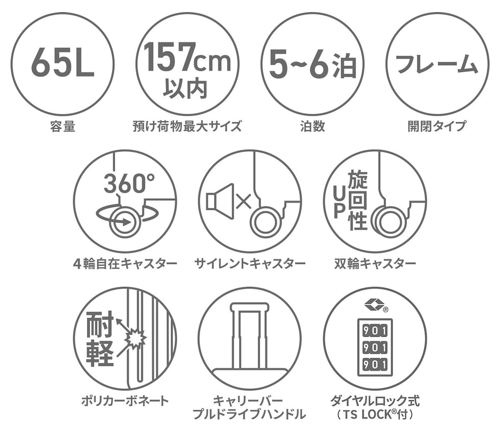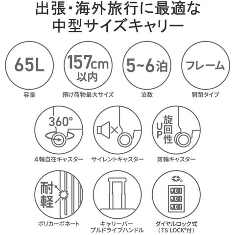 幅広いスタイルにマッチするデザインの「DARJEELING」シリーズ。手荷物預け無料サイズの本体は、5~6泊程度の出張や海外旅行に適したモデルです。ボディには、軽量で高耐久なポリカーボネートを採用しているため、タフに活用可能。その他、ワンタッチプッシュでスムーズに開閉できるTSAロックを搭載するなど、旅をサポートする機能をしっかり備えたアイテムです。