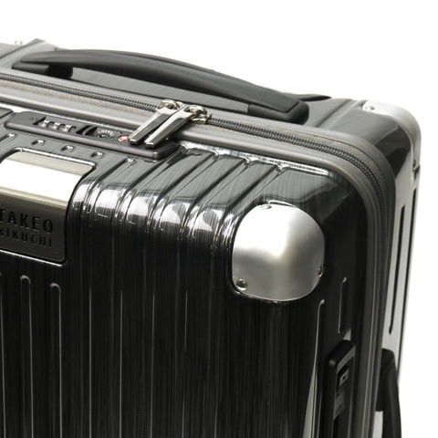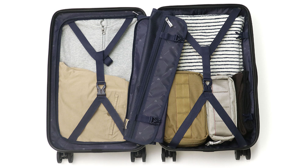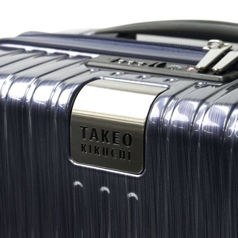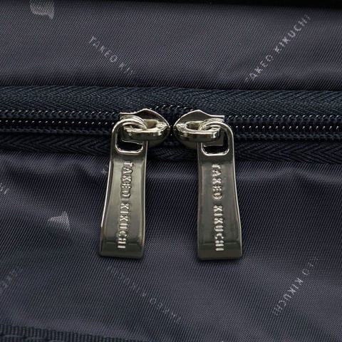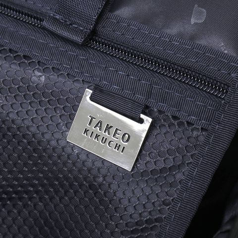収納スぺースは両面にクロスベルトを備えたつくりで、荷物をしっかりと固定。1~2泊程度の旅行や出張に便利な国内線機内持ち込みサイズで、小回りの効く使い勝手の良い大きさです。また、オリジナルの生地と引手を使用し「TAKEO KIKUCHI」のロゴプレートがワンポイントになっています。