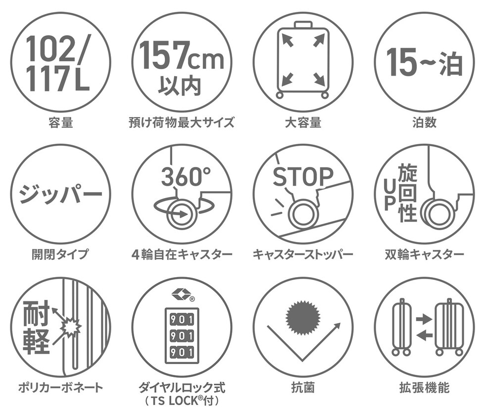 ・こちらの商品はエキスパンダブル機能の拡張時が縦+横+高さの3辺の和が157cmを超えるサイズです。一部航空会社の預け荷物について、超過手荷物料金が発生する場合がございます。航空会社によって規定が異なりますので、詳しくはご購入前にご利用の航空会社へご確認下さい。